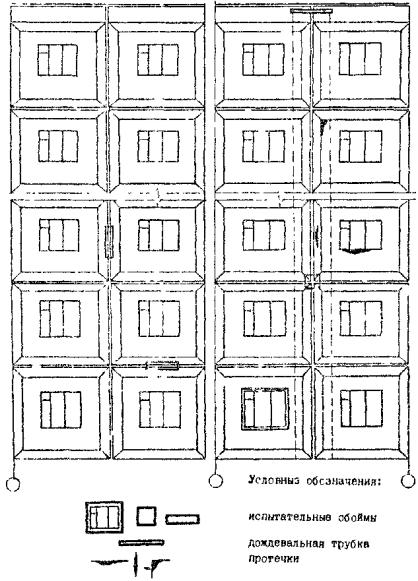 1 - дождевальная трубка; 2 - струбцина; 3 - кронштейн; 4 - шланг для подключения к водопроводу ПРИЛОЖЕНИЕ 8Рекомендуемое СОДЕРЖАНИЕ ПРОТОКОЛА ИСПЫТАНИЙОсновные данные об испытываемых образцах (наименование, тип, серия, год постройки, завод-изготовитель и т.д.): - дата проведения испытаний; - условия проведения испытаний (температура окружающего воздуха, атмосферное давление); - параметры испытаний (расход воды на дождевание, л/мин на 1 п.м. трубки, продолжительность дождевания, испытательное давление); - перечень средств измерений; Результаты испытаний (наличие или отсутствие протечек, количественная оценка воздухопроницаемости). Приложения: схемы фрагментов зданий с указанием мест размещения испытательных обойм, дождевальных трубок, времени и мест появления протечек и т.д. Заключение о соответствии полученных результатов нормативным требованиям. Рекомендации. Подпись лица, производившего испытания с указанием фамилии и должности. ПРИЛОЖЕНИЕ 9Рекомендуемое Пример схемы фрагмента здания с указанием мест расположения дождевальных трубок и протечек
