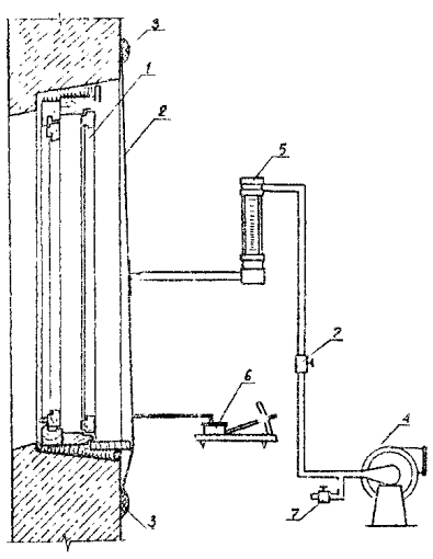 1 - окно; 2 - воздухонепроницаемая оболочка; 3 - герметизирующая мастика; 4 - вентилятор; 5 - ротаметр; 6 - микроманометр; 7 - кран для регулирования перепада давлений ПРИЛОЖЕНИЕ 12Рекомендуемое Схема подключения установки ВСК-1 для испытания строительных конструкций на воздухопроницаемость