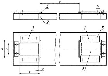 1) z = 65,9 мм для испытания патронов G5 (получено из максимального значения размера А лампы мощностью 4 Вт; см. МЭК 60081). z = 367,4 мм для испытания патронов G13 (получено из максимального значения размера А лампы мощностью 15 Вт; см. МЭК 60081). Рисунок предназначен только для иллюстрации основных размеров. Назначение: проверка соответствия комплекта (пары) патронов «проходному» калибру и наличия контакта. Испытание: монтажные пластины с закрепленными на них патронами вставляют в монтажное приспособление, прижимают к упору и фиксируют зажимными скобами. В этом положении вставляют калибры. Рисунок 1 - Монтажное приспособление для испытания патронов для ламп В миллиметрах
