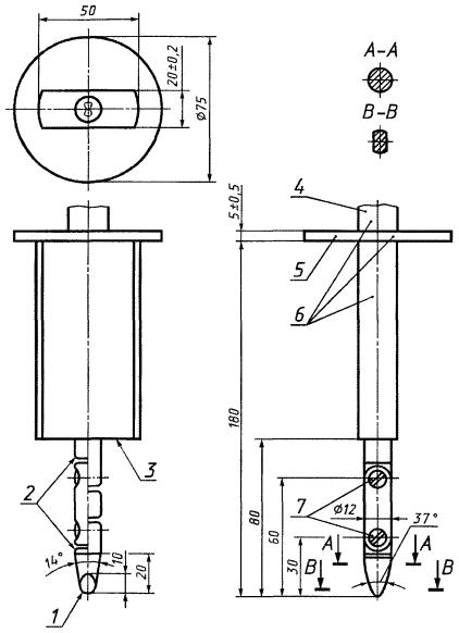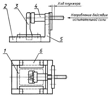 1) Если патрон предназначен для установки на основание из тонкого материала, то до этого значения доводят только непосредственно место, на котором устанавливают патрон на монтажной пластине. Материал: сталь 1 - линия, на которой располагается центр патрона; 2 - сторона упора, которая должна иметь маркировку Рисунок предназначен только для иллюстрации основных размеров. Для патронов, которые предназначены для монтажа только на вертикальной поверхности, на монтажной пластине устанавливают дополнительно стальной уголок. Стальной уголок должен быть таким, чтобы усилие 50 Н, приложенное к верху этого уголка в направлении оси патрона, не изменяло положение верха уголка более чем на 0,2 мм относительно начального положения. Рисунок 2 - Монтажная пластина 1 - монтажная пластина (см. рисунок 2); 2 - опора; 3 - патрон; 4 - испытательный цоколь (см. рисунок 4); 5 - рама; 6- зажимная скоба, перекрывающая монтажную пластину на 10 мм. Показанное на рисунке устройство предназначено для испытания одноламповых патронов. Для испытания сдвоенных патронов должны применяться соответствующие устройства. Назначение: проверку проводят при сомнении, к какому типу компенсированному или некомпенсированному, относится патрон. Испытание: патрон, закрепленный на монтажной пластине, устанавливают на опоре и испытательный цоколь вводят в патрон. Пластину перемещают так, чтобы цоколь был между патроном и рамой без зазора. В этом положении пластину крепят с помощью зажимных скоб. К цоколю плунжером прикладывают усилие до тех пор, пока не будет достигнуто требуемое расстояние перемещения* плунжера. Усилие для патронов G5 и G13 должно быть не менее 15 и 30 Н соответственно. Испытание повторяют 10 раз. * Перемещение плунжера, соответствующее минимальному осевому перемещению, необходимому для получения контакта, равно: - для пары патронов с боковым вводом: 3 мм + монтажный допуск**; - для пары патронов с осевым вводом: 3 мм + максимальная длина штырьков цоколя (7,62 мм пересматривается) + монтажный допуск**. Если комбинация пары патронов включает два компенсированных патрона, то каждый патрон должен обеспечивать половину компенсации. ** Устанавливается по указанию изготовителя (см. 8.3). По окончании испытания не должно быть зазора как между испытательным цоколем и рамой, так и между испытательным цоколем и патроном. В этом случае патрон относят к компенсированным, в противном случае - к некомпенсированным. Рисунок 3 - Устройство для определения наличия компенсации у патронов для ламп В миллиметрах