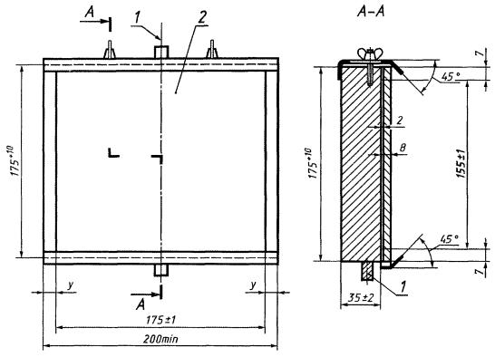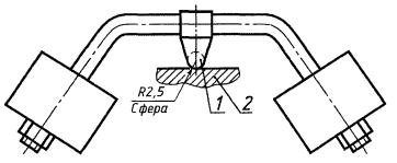 Рисунок предназначен только для иллюстрации основных размеров калибра. Назначение: проверка механической прочности патронов G13, имеющих поворотный вкладыш. Испытание: в соответствии с 14.4. Рисунок 6 - Шаблон 1 - стальной шарик; 2 - образец Рисунок 7 - Устройство для вдавливания шарика