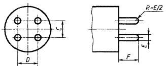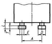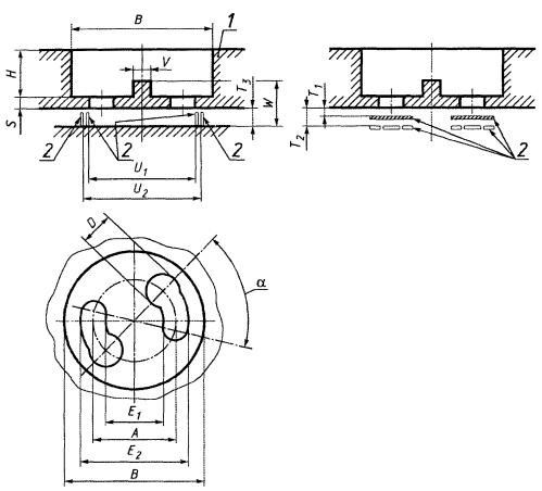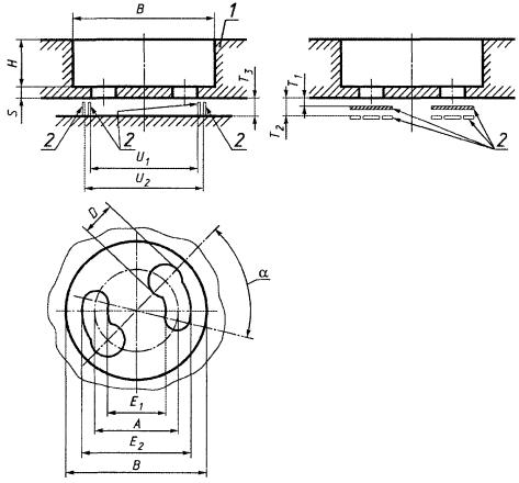 Испытательный цоколь должен иметь внутренний источник тепла, например электрическую обмотку, равномерно распределяющую тепло по его рабочей поверхности. * Рекомендуемое значение для проектирования основания испытательного цоколя. Выбор этих значений служит для унификации испытательных устройств. 1) Испытательный цоколь и основание для испытания цоколя должны быть едиными. 2) Размеры b относятся к номинальным диаметрам лампы. Они не учитывают возможность эксцентричности цоколей, относящихся к трубке лампы. 3) Возможны другие размеры (например 40 и 50 мм) посредством заменяемых колец. Рисунок 9 - Испытательный цоколь G13 и испытательное устройство для испытания теплостойкости патронов G13 с маркировкой Т (см. 17.1) Вариант расположения контактов 1 - изолирующий материал; 2 - контакты Размеры в миллиметрах