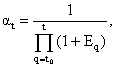 4.6. При наличии информации о переменных во времени нормах дисконта и степени риска проекта необходимо в расчетах оценок эффективности использования в дорожном хозяйстве инноваций и достижений научно-технического прогресса задействовать различные коэффициенты дисконта на разных шагах расчета. Это условие необходимо соблюдать при выполнении масштабных исследований, единовременные затраты в которые осуществляются в течение ряда лет. Технически приведение к сопоставимому моменту времени затрат и результатов, имеющих место на t-м шаге расчета реализации рассматриваемого мероприятия, производится путем их умножения на коэффициент дисконтирования соответствующего шага, рассчитываемого по формуле:
