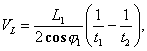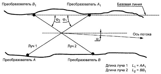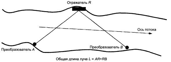 где L1 - длина акустического луча АА1, м; φ1 - угол между средним направлением потока и акустическим лучом, ... °; t1 - время прохождения ультразвукового импульса от преобразователя А к преобразователю А1, с; t2 - время прохождения импульса от преобразователя А1 к преобразователю А, с. 4.7.1.2 Системы с отраженным лучом Среднюю скорость потока воды в слое акустического луча параллельно оси русла VL, м/с, в системе с отраженным лучом и преобразователями на одном берегу (рисунок 2) вычисляют по упрощенной формуле