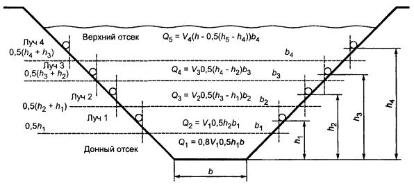 где L - длина отраженного акустического луча ARB, м; Ln - проекция отрезка, ограниченного преобразователями, расположенными выше и ниже по течению, на ось (линию) среднего направления потока, м; t3 - время прохождения импульса от преобразователя А, расположенного выше по течению через отражатель R на противоположном берегу до преобразователя В, расположенного ниже по течению, с; t4 - время перемещения импульса в обратном направлении, с. 4.7.1.3 Вычисление расхода в однолучевых системах В системах, где скорость определяется с помощью одного луча, необходимо найти соотношение между измеренной скоростью и средней скоростью в сечении (как указано в 4.3.2.2). По найденной зависимости и при ее постоянстве расход воды Q, м3/с, вычисляют по формуле Q = CvVA, (5) где V - скорость, найденная однолучевым измерением, м/с; А - площадь поперечного сечения, м2; Cv - эмпирически определенный коэффициент (скоростной коэффициент). Значение коэффициента Cv находят в результате измерений полей скоростей при различных расходах и в различные периоды. Он может оставаться постоянным или изменяться дискретно. Поле скоростей измеряют с помощью обычной гидрометрической вертушки или используя ультразвуковую систему, если возможно перемещение преобразователей по глубине. 4.7.2 Последовательность и частота опроса в многолучевой системе, ждущий режим работы Период одного цикла излучения и опроса всех погруженных в поток преобразователей должен быть таким, чтобы измеряемый расход оставался практически постоянным и одновременно достаточным для обработки данных измерений и получения значения расхода. Чтобы не вышли из строя преобразователи, находящиеся в момент измерения выше уровня воды, конструкция системы должна обеспечивать для них ждущий режим работы. Удовлетворительный результат достигается, когда система может выполнять не менее 30 полных циклов опроса всех преобразователей в минуту. При повышенных требованиях к надежности измерительной системы и устранения влияния возможных сбоев при ее работе по различным причинам частота опроса должна быть увеличена. 4.7.3 Вычисление расхода в многолучевых системах 4.7.3.1 Измерение расхода ультразвуковым способом аналогично измерению расхода гидрометрической вертушкой. Однако особенностью ультразвукового способа является то, что области измерения скоростей (послойные отсеки) ориентированы горизонтально и распределены по вертикали. 4.7.3.2 Для вычисления расхода наиболее целесообразными являются способы, при которых суммируются расходы в послойных отсеках. Количество и размеры отсеков (ширина и высота) определяются количеством пар ультразвуковых преобразователей и схемой их расположения на откосах (берегах) русла. Общий расход Qs, м3/с, вычисляют как сумму послойных расходов Qi, по формуле
