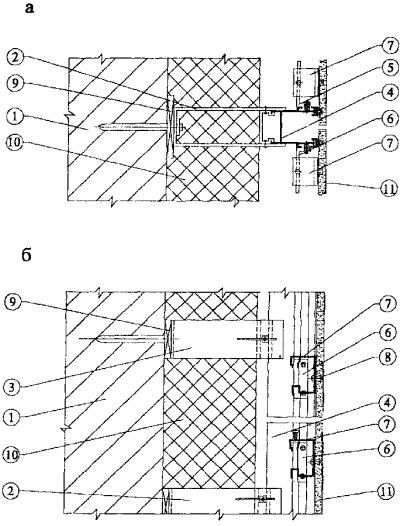 1. Основание. 2. Кронштейн несущий. 3. Вертикальный элемент. 4. Плита керамогранита. 5. Утеплитель минераловатный. 6. Алюминиевый уголок. 7. Дополнительный алюминиевый профиль. 8. Болт из оцинкованной стали. 9. Анкерный болт. 10. Паронитовая прокладка. Рис. 3.19. Узел крепления системы «U-KON» на наружном углу здания 1. Основание. 2. Кронштейн несущий. 3. Вертикальный профиль. 4. Утеплитель. 5. Плита керамогранита. 6. Кляммер. 7. Усилитель угловой. 8. Покрытие. 9. Профиль алюминиевый. 10. Кронштейн специальный. 11. Анкерный болт. Рис. 3.20. Узел примыкания системы «U-KON» к парапету на примере подсистемы АТС-204А 4. Исходные данные для проектирования системы4.1. Проектно-сметная документация на систему для конкретного объекта разрабатывается на основе задания на проектирование, подготовленного в соответствии с существующим в г. Москве порядком и утвержденного заказчиком. Задание на проектирование обязательно должно содержать требование о соответствии системы II этапу энергосбережений СНиП II-3-79* (изд. 1998 г.) и МГСН 2.01-99. 4.2. Задание на проектирование должно включать следующие исходные данные: - архитектурные чертежи фасадов здания, включающие данные о фактуре и цвете облицовочных материалов, чертежи архитектурных деталей (карнизов, обрамления проемов и т.п.) и другие необходимые данные, если это не входит в состав работ по данному заданию; - строительные чертежи наружных стен от фундаментов до парапетов, включая узлы, поясняющие решение и размеры всех конструкций; - данные от разработчиков фундаментов о величине допустимой дополнительной нагрузки на стены здания или заключение компетентной организации о несущей способности фундаментов здания; - план участка, где расположено здание. Для реконструируемых зданий задание на проектирование дополнительно должно содержать акт обследования наружных стен здания, где указывается состояние поверхности фасадов, результаты испытаний на усилия, с которым принятые дюбели можно вырвать из стены и геодезическую съемку поверхностей фасадов с данными о величине отклонений их отдельных участков от вертикальной плоскости. 4.3. К заданию на проектирование должно быть приложено Приложение к Техническому свидетельству Госстроя России на эту фасадную систему. 5. Определение основных параметров системы5.1. К основным параметрам системы следует отнести: - тип и размер облицовочных материалов и способ их крепления к несущему каркасу; - характеристику принятых плит утеплителя: марку, размеры, плотность, теплопроводность, наличие или отсутствие защитного слоя; - величину воздушного зазора; - схему размещения на фасаде здания кронштейнов и вертикальных профилей со всеми необходимыми размерами, в том числе, расстояние от основания до экрана; - марку дюбелей для крепления кронштейнов несущего каркаса к основанию; - марку дюбелей для крепления плит утеплителя к основанию. 5.2. Тип и размер облицовочных плит, их цвет, фактуру поверхности и способ крепления к несущему каркасу, определяет главный архитектор проекта, если эти данные не приведены в задании на проектирование системы. 5.3. Выбор плит утеплителя выполняется на основании теплотехнических расчетов, методика которых приводится ниже. Там же (в разделе «Теплотехнические расчеты») имеются рекомендации по определению величины воздушного зазора. В случае применения плит утеплителя с 