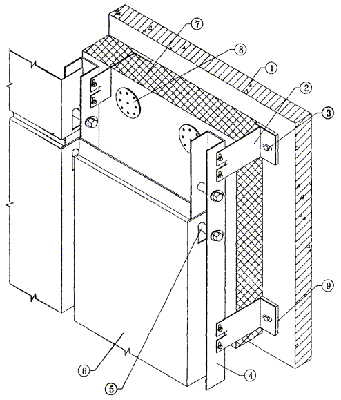 1. Основание. 2. Кронштейн «L»-образный. 3. Анкерный болт крепления кронштейна. 4. Вертикальный профиль. 5. Горизонтальный стержень в вертикальном профиле для навески кассетной панели. 6. Кассетная панель. 7. Утеплитель. 8. Дюбель для крепления утеплителя. 9. Паронитовая прокладка. Рис. 3.2. Системы «Интерал» (Т-МХ-ВХ) с облицовкой кассетами.