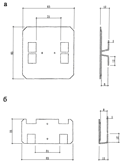 1. Основание. 2. Кронштейн «L»-образный. 3. Анкерный болт крепления кронштейна. 4. Вертикальный профиль. 5. Горизонтальный профиль. 6. Кронштейн для скрытого крепления облицовочных плит. 7. Облицовочная плита керамогранита. 8. Утеплитель. 9. Тарелочный дюбель крепления утеплителя. 10. Паронитовая прокладка. Рис. 3.4. Системы «Интерал» (Т-КС-ВГХ) с облицовкой плитами керамогранита со скрытым креплением. Рис. 3.5. Система «Интерал», кронштейны. Рис. 3.6. Система «Интерал», вертикальные профили (поперечное сечение). Рис. 3.7. Кляммеры (скобы) для крепления плит керамогранита. а - рядовые (промежуточные); б - крайние Рис. 3.8. Детали несущего каркаса для скрытого крепления плит керамогранита. а - горизонтальный профиль; б - кронштейн 1. Основание. 2. Кронштейн (С-образный элемент и флажок). 3. Анкерный болт. 4. Вертикальный профиль. 5. Утеплитель. 6. Экран (алюминиевые листы). 7. Заклепка. 8. Паронитовая прокладка. Рис. 3.9. Система «Интерал», с облицовкой алюминиевыми листами. а - вертикальный разрез; б - горизонтальный разрез