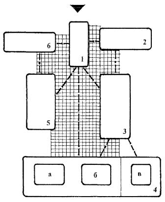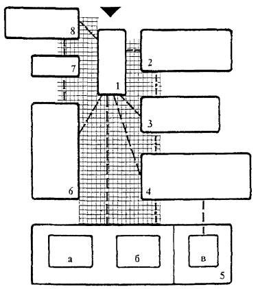 Рис. 2. Схема функциональной структуры ОУ-2. 1. Вестибюльная группа помещений. 2. Помещения проживания. 3. Помещения питания. 4. Помещения общего образования. 5. Помещения досугового и физкультурно-оздоровительного назначения: а. - физкультурно-оздоровительные; б. - досуговые; в. - начальное профессиональное и дополнительное образование. 6. Лечебно-реабилитационные помещения. 7. Медицинский изолятор. 8. Административно-бытовые помещения. Условные обозначения.