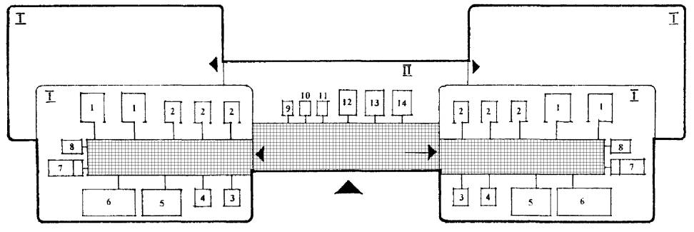 Помещения проживания. 5.80. Помещения проживания предусматриваются в ОУ-2. Рекомендуемые состав и площади помещений проживания приведены в таблице 5.8. 5.81. Помещения проживания следует размещать в соответствии с требования п.п. 5.3. и 5.4. настоящих Рекомендаций. 5.82. Помещения проживания следует проектировать по типу школ-интернатов (МГСН 4.15-98). 5.83. Помещения проживания в ОУ-2 рекомендуется проектировать в виде изолированных жилых секций, объединяющих 3 - 4 жилые группы на 9 чел. каждая, организованные по половозрастному принципу. Секции для мальчиков и девочек рекомендуется размещать поэтажно с возможностью полной изоляции. Функционально-планировочная схема помещений жилой секции представлена на Рис. 3. 5.84. В состав жилой группы входят: - три спальные комнаты на 1 место; - две спальные комнаты на 3 места; - комната приготовления уроков; - гостиная; - санитарный узел; - душевая; - комната дежурного воспитателя с санитарным узлом в шлюзе; - гардеробная для хранения одежды и личных вещей воспитанников. 5.85. В состав жилой секции, помимо жилых групп, следует включать: - бытовую комнату; - комнату дежурной медицинской сестры; - инвентарную; - кладовую чистого белья; - кладовую грязного белья; - комнату хранения уборочного инвентаря. 5.86. Между спальными помещениями и коридором следует предусматривать глухие (не открывающиеся) окна для организации наблюдения за воспитанниками в ночное время. 5.87. В состав оборудования спальных комнат входят кровати и стулья в соответствии с количеством мест в комнате. Гардеробная оборудуется шкафами-купе с секциями по количеству воспитанников в жилой группе. Рис. 3. Функционально-планировочная схема жилой секции на 4 жилые группы по 9 воспитанников I - Помещения жилой группы: 1.