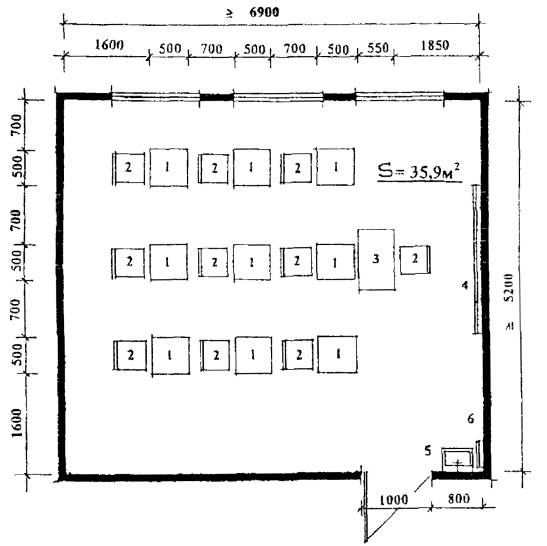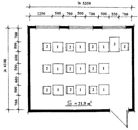 Помещения общего образования. 5.34. Рекомендуемые состав и площади помещений общего образования, общие для всех типов ОУ, приведены в таблице 5.2. Площади помещений общего образования, на которые в «Рекомендациях» отсутствуют габаритные схемы, определены в соответствии с МГСН 4.06-96. 5.35. Данная группа помещений обеспечивает проведение мероприятий, направленных на: - обучение по образовательным программам в соответствии с возрастными и индивидуальными особенностями детей и подростков, на уровне, предусмотренном Законом Российской Федерации «Об образовании»; - психолого-педагогическую помощь в усвоении образовательных программ; - образование воспитанников с отклонениями в развитии. 5.36. Помещения общего образования должны группироваться в блоки: начальная, основная и старшая школы. Формирование контингента классов во всех типах ОУ происходит по уровню обученности воспитанников. 5.37. Наполняемость классов принимается в соответствии с «Рекомендациями по проектированию образовательных учреждений для детей, нуждающихся в психолого-педагогической и медико-социальной помощи» - 9 чел. 5.38. В блоке помещений общего образования следует предусмотреть рекреации из расчета 1,2 м2 на 1 учащегося. 5.39. В состав помещений начальной школы рекомендуется включать игровые комнаты, рассчитанные на одновременное пребывание 18 учащихся. Необходимость и количество игровых комнат определяется заданием на проектирование. 5.40. В составе группы помещений основной и старшей школы предусмотрены неспециализированные классные помещения и специализированные кабинеты: физики-химии, иностранного языка, биологии, компьютерный класс. Учебные помещения должны отвечать требованиям активного ведения учебного урока с организацией как фронтальных, так и групповых и индивидуальных форм обучения с широким привлечением технических средств. 5.41. Учитывая специфику контингента воспитанников, неспециализированные классные помещения следует проектировать с трехрядной расстановкой одноместных парт. Количество неспециализированных классных помещений определяется в каждом конкретном случае заданием на проектирование. 5.42. Учитывая специфику контингента воспитанников ОУ-2, в оборудование как специализированных, так и неспециализированных классных помещений не следует включать стеллажи с пособиями. В данном случае хранение пособий должно быть предусмотрено либо в лаборантских, либо в учительской. 5.43. В состав помещений общего образования входит библиотека с книгохранилищем и читальным залом. 5.44. Проектирование санитарных узлов при учебных помещениях осуществляется в соответствии с МГСН 4.06-96. Таблица 5.2. Рекомендуемые состав и площади помещений общего образования.