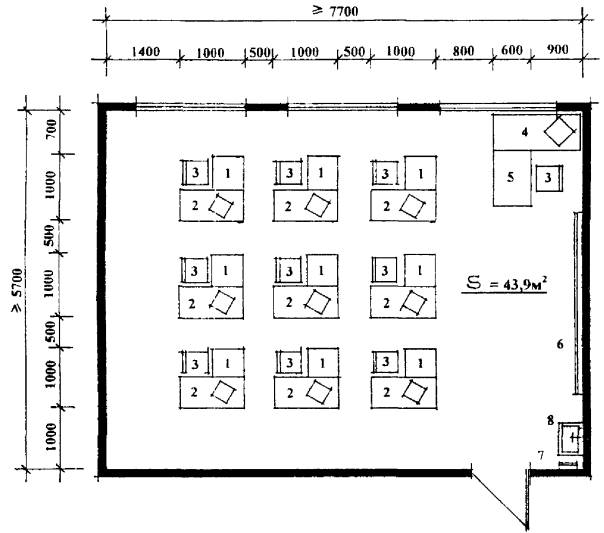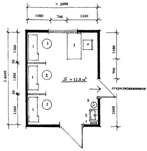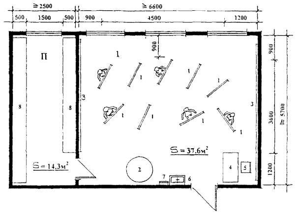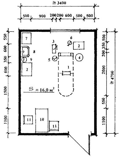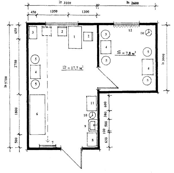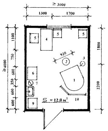 ЭКСПЛИКАЦИЯ ОБОРУДОВАНИЯ I. ИЗОСТУДИЯ 1. Мольберт 2. Помост для моделей 3. Стенд для рисунков и картин 4. Стол преподавателя 5. Стул преподавателя 6. Умывальник 7. Вешалка для полотенца II. КЛАДОВАЯ 8. Комбинированный шкаф Рис. П.10. Изостудия с кладовой ЭКСПЛИКАЦИЯ ОБОРУДОВАНИЯ I. КАБИНЕТ ГИНЕКОЛОГА-ВЕНЕРОЛОГА 1. Кресло гинекологическое 2. Винтовой табурет 3. Передвижной светильник 4. Стол врача 5. Стул 6. Столик инструментальный 7. Бачок для мусора 8. Умывальник 9. Шкаф медицинский 10. Ширма Рис. П.11. Кабинет гинеколога-венеролога. II. КАБИНЕТ СТОМАТОЛОГА 1. Кресло стоматологическое 2. Столик инструментальный 3. Установка стоматологическая универсальная 4. Винтовой табурет 5. Плевательница 6. Светильник 7. Шкаф медицинский 8. Умывальник 9. Бачок для мусора 10. Стол врача 11. Стул Рис. П.12. Кабинет стоматолога. ЭКСПЛИКАЦИЯ ОБОРУДОВАНИЯ 1. Стол врача 2. Стул 3. Столик с набором линз для проверки остроты зрения 4. Офтальмологические установки 5. Табурет винтовой 6. Кушетка смотровая 7. Таблица 8. Шкаф медицинский 9. Умывальник 10. Бачок для мусора 11. Столик инструментальный 12. Светозащитная штора Рис. П.13. Кабинет офтальмолога с темной комнатой. ЭКСПЛИКАЦИЯ ОБОРУДОВАНИЯ 1. Стационарная ингаляционная установка 2. Винтовой табурет 3. Стол процедурной медсестры 4. Стул 5. Умывальник 6. Бачок для мусора 7. Вешалка для полотенца Рис. П.14. Ингаляторий на 3 места ЭКСПЛИКАЦИЯ ОБОРУДОВАНИЯ 1. Кушетка 2. Столик с аппаратурой 3. Столик с аппаратурой для приема процедур сидя 4. Стул 5. Стол врача 6. Шкаф медицинский 7. Умывальник 8. Вешалка для полотенца Рис. П.15. Кабинет физиотерапии. ЭКСПЛИКАЦИЯ ОБОРУДОВАНИЯ I. ЗАЛ 1. Стол методиста 2. Стул методиста 3. Шведская стенка 4. Скамья 5. Зеркало 6. Маты для занятий II. КЛАДОВАЯ 7. Комбинированный шкаф 8. Манеж для складирования мячей III. РАЗДЕВАЛКА 9. Скамья для переодевания 10. Шкаф методиста 11. Крючки для одежды 12. Умывальник 13. Вешалка для полотенца Рис. П.16. Кабинет групповых занятий ЛФК с кладовой и раздевалкой ЭКСПЛИКАЦИЯ ОБОРУДОВАНИЯ 1. Стол 2. Стул 3. Стол специалиста 4. Кресло 5. Шкаф-стеллаж 6. Умывальник 7. Вешалка для полотенца Рис. П.17. Кабинет групповой психотерапии на 9 человек. ЭКСПЛИКАЦИЯ ОБОРУДОВАНИЯ 1. Рабочий стол 2. Стул 3. Стол специалиста 4. Компьютерный стол специалиста с компьютером 5. Стеллаж 6. Ученическая доска 7. Умывальник 8. Вешалка для полотенца Рис. П.18. Зал ситуационных игр. ЭКСПЛИКАЦИЯ ОБОРУДОВАНИЯ 1. Стол ученический 2. Стул 3. Стол воспитателя Рис. П.19. Комната приготовления уроков.