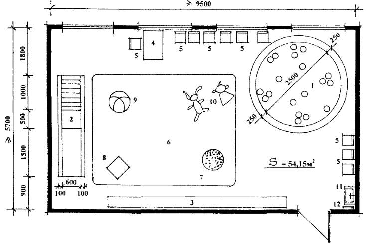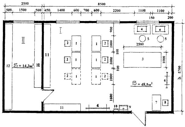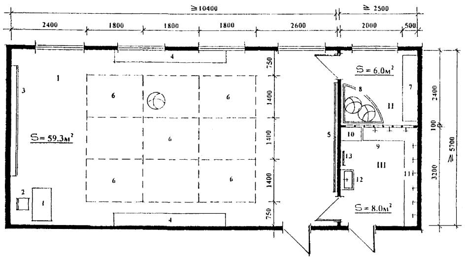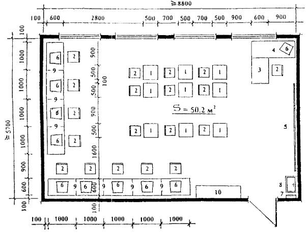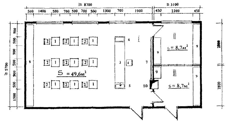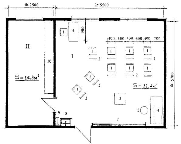 ЭКСПЛИКАЦИЯ ОБОРУДОВАНИЯ I. КОМНАТА 1. Стул 2. Пюпитр 3. Помост для преподавателя 4. Пианино 5. Табурет винтовой 6. Стол преподавателя 7. Классная доска 8. Умывальник 9. Вешалка для полотенца II. КЛАДОВАЯ 10. Комбинированный шкаф Рис. П.9. Комната музыкальных занятий с кладовой инструментов.