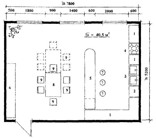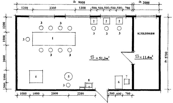 Помещения питания. 5.71. Питание для воспитанников ОУ организуется в одну смену в общей столовой. 5.72. Площадь обеденного зала принимается из расчета 1,1 м2 на 1 посадочное место; при зале предусматривается умывальная из расчета 3 м2 (1 умывальник) на каждые 20 мест. 5.73. В производственные помещения кухни должен предусматриваться отдельный вход. 5.74. Кроме питания воспитанников, помещения кухни должны обеспечивать питание персонала. 5.75. Состав, площади и оборудование производственных помещений кухни в ОУ следует определять заданием на проектирование, исходя из возможностей работы на полуфабрикатах или на сырье, учитывая наличие базового предприятия школьных столовых в муниципальном районе. Работа технологического оборудования кухни предусматривается на электричестве. 5.76. Для питания персонала предусматривается обеденный зал самообслуживания (или буфет) из расчета 1,1 м2 на 1 посадочное место. Его следует располагать в составе помещений кухни или вблизи нее. Количество мест определяется заданием на проектирование, исходя из количества питающихся в учреждении, продолжительности обеденного времени и количества смен. При зале предусматривается подсобное помещение площадью 8 м2, предназначенное для раздачи пищи, хранения и мойки посуды. 5.77. Для обслуживания изолятора в ОУ-2 при помещениях кухни следует предусматривать раздаточную, имеющую удобную связь с изолятором. 5.78. Учитывая специфику контингента воспитанников ОУ-2 (как правило, наличие хронических заболеваний в запущенной форме) в состав производственных помещений кухни следует включать кабинет диетсестры. 5.79. Рекомендуемые состав и площади производственных помещений кухни приведены в табл. 5.7. Таблица 5.7. Рекомендуемые состав и площади производственных помещений кухни.