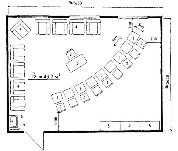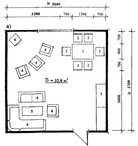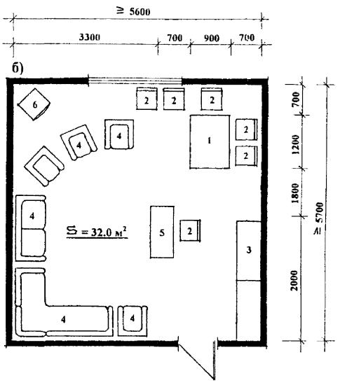 ЭКСПЛИКАЦИЯ ОБОРУДОВАНИЯ 1. Игровой стол 2. Стул 3. Комбинированный шкаф 4. Мягкая мебель 5. Журнальный стол 6. Телевизор Рис. П.20. Примеры расстановки оборудования гостиной. |