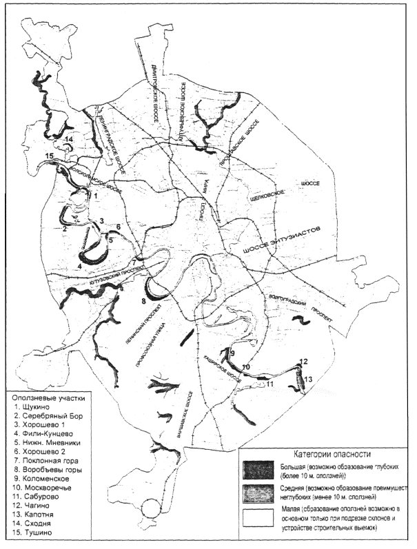 РЕКОМЕНДАЦИИ Москва 2002 ПРЕДИСЛОВИЕ 1. Разработаны Государственным унитарным предприятием «Экспертно-инновационный центр по делам гражданской обороны и чрезвычайным ситуациям» ГУ ГО ЧС г. Москвы (ГУП ЭкИнЦ, к.т.н. В.В. Белов, к.т.н. В.Н. Лисица), Институтом геоэкологии Российской Академии Наук (ИГЭ РАН, д.г.-м.н. А.Л. Рагозин (руководитель работы), к.г.-м.н. Г.И. Батрак, к.г.-м.н. О.Н. Болагаева, к.г.-м.н. В.Н. Бурова, д.г.-м.н. В.М. Кутепов, к.т.н. В.А. Пырченко, инж. А.В. Уварова), Государственным унитарным предприятием «Институт по проектированию промышленных и транспортных объектов для городского хозяйства г. Москвы» (ГУП Моспромпроект, инж. М.И. Виноградов, инж. Н.И. Виноградов), Государственным унитарным предприятием «Научно-исследовательский и проектный институт Генерального плана г. Москвы» (ГУП НИИПИ Генплана г. Москвы, инж. В.Д. Форапонов), Открытым акционерным обществом «Центральный научно-исследовательский и проектно-экспериментальный институт промышленных зданий и сооружений» (ОАО ЦНИИпромзданий, к.т.н. А.Г. Беляев), Комитетом по архитектуре и градостроительству г. Москвы (Москомархитектура, к.т.н. А.А. Хомко). 2. Согласованы ГУП НИИПИ Генплана г. Москвы 3. Внесены ГУП ЭкИнЦ ГУ ГО ЧС г. Москвы 4. Подготовлены к утверждению и изданию ИГЭ РАН (д.г.-м.н. А.Л. Рагозин) и Москомархитектурой (к.т.н. А.А. Хомко) 5. Утверждены ГУ ГО ЧС г. Москвы 05.04.2002 г. и Москомархитектурой 01.08.2002 г. 6. Введены в действие приказом по Москомархитектуре от 01.08.2002 г. № 141. 7. Разработаны впервые. СОДЕРЖАНИЕ ВВЕДЕНИЕНастоящие Рекомендации разработаны в соответствии с распоряжением Премьера Правительства Москвы от 30.03.2000 г. № 289-РП «О разработке нормативно-методических документов по разделу «Инженерно-технические мероприятия гражданской обороны. Мероприятия по предупреждению чрезвычайных ситуаций» на основе Закона города Москвы «О защите населения и территорий города от чрезвычайных ситуаций природного и техногенного характера» от 5 ноября 1997 г. № 46 и развивают обязательные положения и требования СНиП 11-02-96. «Инженерные изыскания для строительства. Основные положения», СП 11-107-98. Порядок разработки и состав раздела «Инженерно-технические мероприятия гражданской обороны. Мероприятия по предупреждению чрезвычайных ситуаций» проектов строительства, СП 15-12-01. «Порядок разработки и состав раздела «Инженерно-технические мероприятия гражданской обороны. Мероприятия по предупреждению чрезвычайных ситуаций» градостроительной документации для территорий городских и сельских поселений, других муниципальных образований» и «Временного положения о составе мероприятий по предупреждению чрезвычайных ситуаций в специальном разделе «Инженерно-технические мероприятия гражданской обороны. Мероприятия по предупреждению чрезвычайных ситуаций» градостроительной документации г. Москвы». Рекомендации устанавливают общие положения и требования к содержанию и методике количественной оценки геологического риска экономических и социальных потерь при обосновании мероприятий по предупреждению чрезвычайных ситуаций природного характера, схем и проектов инженерной защиты территорий, зданий и сооружений от опасных природных и техноприродных процессов, разрабатываемых на соответствующих этапах (стадиях) освоения и использования территории г. Москвы и ее отдельных частей, в составе гр