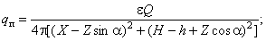 a - угол отклонения пламени (угол между вертикалью ствола свечи и осью пламени), град, tg a = n/n; e - коэффициент излучения пламени (принимается по справочным данным). Значение qп.д, кВт/м2, рекомендуется принимать: У основания ствола печи................................................................................... 9,4 При условии эвакуации персонала в течение 30 с.......................................... 4,8 На ограждении факельной установки и при условии: эвакуации персонала в течение 3 мин........................................................ 2,8 неограниченного пребывания персонала................................................... 1,4 2. Расчетные формулы. 2.1. Плотность теплового потока qп проверяют при выбранной высоте ствола свечи H и заданном расстоянии X. Минимальное расстояние между стволом свечи и объектом определяют при выбранной высоте ствола свечи. Высоту ствола свечи определяют при заданном расстоянии между стволом свечи и объектом: