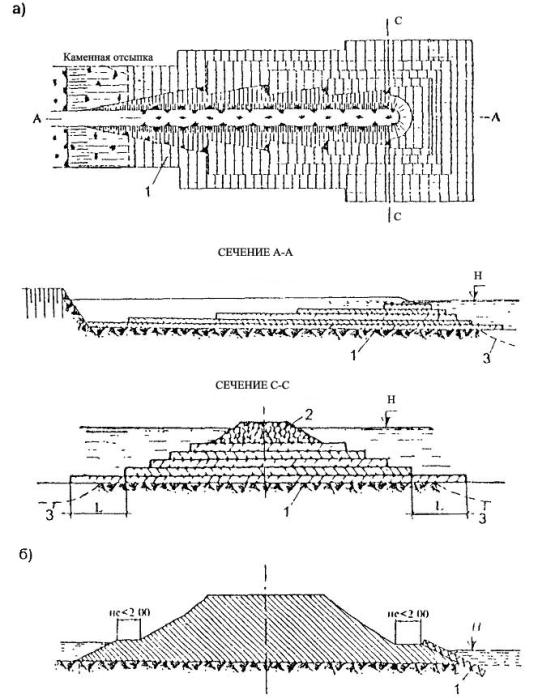 - неотложной защиты подтопляемых насыпей, подмостовых конусов, опор мостов и регуляционных сооружений в период проявления опасных разрушающих воздействий паводков.
