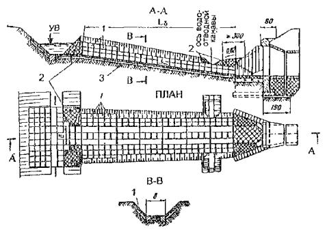 - кюветов, водоотводных канав, водовыпусков из откосных лотков и рассеивающих трамплинов и других водоотводных и водогасящих сооружений;
