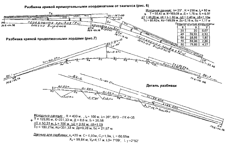 Для валки и раскряжевки деревьев применяются кусторезы, корчеватели, бульдозеры, электро-, мотопилы, сучкорезы и т.д. Трелевку леса осуществляют тракторами, тракторными лебедками и лесовозами. Пни диаметром до 50 см удаляют корчевательными машинами, лебедками, бульдозерами, рыхлителями, а диаметром более 50 см - взрывным способом. Снятый растительный слой используется для рекультивации земель. Технология расчистки полосы отвода изложена в табл. 29 и на рис. 5. Таблица 29 Технология очистки полосы отвода 1 км Разбивка горизонтальных кривых на автомобильных дорогах Горизонтальные кривые разбивают: прямоугольными координатами от тангенса; продолженными хордами; кратными кривыми; прямоугольными координатами от хорд; другими способами разбивки. Разбивка кривых прямоугольными координатами от тангенса (рис. 6) Этот способ является основным при разбивке горизонтальных кривых. Методика разбивки кривых прямоугольными координатами от тангенса зависит от величины радиуса кривой. 1. Радиус горизонтальной кривой на дорогах I-а(б) категорий - более 3000 м, II, III, IV, I-с (а) категорий - более 2000 м, I-c, 1-с-б(в), II-с-а(б) категорий - более 600 м, II-с категории - более 400 м, III-с категории - более 300 м. 1.1. По величине радиуса и угла поворота находят длины основных элементов кривой: тангенса (Т), кривой (К), домера (Д) и биссектрисы (Б) (табл. 1 м). 1.2. По величине радиуса определяют значение прямоугольных координат (Xi, Yi) для детальной разбивки кривой от тангенса (табл. 2 м). Нумерация таблиц с индексом «м» указывает на применение таблиц по разбивке горизонтальных кривых Митина Н. А. 2. Радиус горизонтальной кривой на дорогах I-а(б) категорий менее 3000 м, II, III, IV, I-c-a категорий - менее 2000 м, I-c, I-с-б(в), II-с-а(б) категорий - менее 600 м, II-с категории - менее 400 м, III-с категории - менее 300 м. 2.1. По радиусу кривой определяют длину переходной кривой (табл. 6). 2.2. По величине радиуса и угла поворота находят длины основных элементов кривой (Т, К, Д, Б) (табл. 1 м). 2.3. По величине радиуса, переходной кривой и угла поворота определяют дополнение к основным элементам кривой (ΔТ, ΔБ) (табл. 6 м). 2.4. Определяют «суммированные» элементы кривой (Тс, Кс, Дс, Бс). Тc = Т + ΔТ, Кc = К + Iп, Дc = Д + ΔД, Бc = Б + ΔБ. 2.5. По величине радиуса и переходной кривой (Iп) определяют значение прямоугольных координат (Хi, Yi) для детальной разбивки кривой от «суммированного» тангенса (табл. 7 м). Разбивка горизонтальной кривой на местности 1. В обе стороны от вершины угла поворота в створе трассы лентой отмеряют величину тангенса («суммированного» тангенса). Полученные точки закрепляют колышками, обозначающими начало (НК) и конец (КК) кривой. 2. От точки НК (КК) к вершине угла поворота в створе тангенса отмеряют абсциссу (Xi). В полученной точке перпендикулярно к тангенсу отмеряют ординату (Yi) и получают таким образом точки на оси кривой (Ki), которые закрепляют кольями через 10...20 м и сторожками вне границ работы техники. 3. На ось кривой выносят пикеты и «плюсовые» точки, которые закрепляют колышками и сторожками. Разбивка горизонтальных кривых продолженными хордами 1. От вершины угла поворота в створе трассы отмеряют лентой величину тангенса («суммированного» тангенса) и точки закрепляют колышками (НК и КК). 2. От НК (КК) отмеряют по тангенсу Х0 (длина переходной кривой с поправкой на домер), в конце которой по перпендикуляру отмеряют величину Y0 (точка «а0»). 3. На у