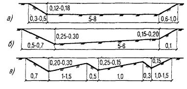 В знаменателе дана крутизна откосов для пылеватых грунтов и одноразмерных мелких песков. Рис. 4 ВЫЕМКИ Примечания: 1. Выемка 7А (7Б), высотой до 1 м, раскрытая (разделанная под насыпь). Применяется в нестесненных условиях. 2. Выемка 8, высотой до 1,0 м, применяется в стесненных условиях и где отсутствуют снежные заносы. Выемки 7 и 8 применяются на начальных участках глубоких выемок длиной не менее 10,0 м. 3. Выемка 9, высотой 1,0-5,0 м, применяется на снегозаносимых участках с шириной полки (обочины) не менее 4,0 м. Для дорог IV-V категорий крутизна внутреннего откоса принимается 1:3. 4. Выемки 10, высотой до 12,0 м применяются на равнинной местности. 5. Выемки 16, высотой до 12,0 м применяются на косогорах от 1:10, 1:3. 6. Крутизна внутренних откосов для дорог IV-V категорий - 1:3. 7. Крутизна внешних откосов принимается: а) песчаные крупно-, среднезернистые, глинистые твердой и полутвердой консистенции грунты - 1:1,5. б) мелкие и пылеватые песчаные, глинистые тугопластичной и мягкопластичной консистенции - 1:2. Выемки Выемки глубиной до 1 м для предохранения от снежных заносов устраивают раскрытыми с крутизной откосов от 1:5 до 1:10 или разделанными под насыпь. Выемки глубиной от 1 до 5 м на снегозаносимых участках сооружают с откосами 1:1,5...1:2 и дополнительной полкой или обочинами шириной не менее 4 м. Типовые насыпи и выемки изображены на рис. 3, 4. В выемках глубиной более 2,0 м, устраиваемых в мелких и пылеватых песках, переувлажненных глинистых грунтах, следует возводить закюветные полки шириной 1,0...2,0 м. Крутизна откосов выемки глубиной до 12 м принимается 1:1,5, а в глинистых пылеватых грунтах - 1:2. Откосы насыпей выемок и водоотводных сооружений должны быть укреплены. Тип укрепления зависит от высоты (глубины) насыпи (выемки), физико-механических свойств грунтов и гидрологического режима подтопления. Типовые конструкции насыпей и выемок приведены на рис. 3, 4. Дорожный водоотвод Водоотвод состоит из ряда сооружений и конструктивных мероприятий (поперечный уклон покрытия, дополнительный слой основания и т.д.), предназначенных для перехвата и отвода воды от земляного полотна. Боковые канавы устраивают в выемках и у насыпи высотой более 2,0 м с продольными уклонами не менее 5 ‰, а в случаях малого естественного уклона - 3 ‰. При явно выраженном уклоне местности боковые канавы устраивают только с нагорной стороны. Глубину канав в равнинной местности назначают 0,7...0,8 м, но не более 1,2...1,5 м с таким расчетом, чтобы низ дренажного слоя (дренажной воронки) возвышался над дном канавы не менее 0,2 м. При продольных уклонах более 10 ‰ необходимо устраивать укрепление откосов и дна канавы (табл. 26). В местах с постоянным избыточным увлажнением дополнительный слой основания устраивается на всю ширину земляного полотна. Таблица 26 Укрепление откосов и дна боковых канав