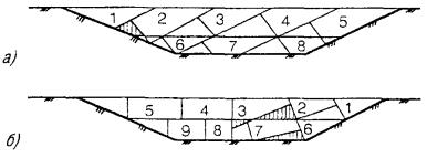 Разработка грунта скрепером производится путем равномерного (а) снятия стружки, клинового (6) и гребенчатого (в) зарезания. Равномерное снятие грунта скрепером применимо для зачистки резервов и выемок, клиновая - при разработке грунтов I и II группы, а гребенчатая - II...IV группы грунтов. Грунты разрыхляют на толщину снимаемого слоя, избегая его измельчения, так как это ухудшает наполнение ковша. Разработку выемки ведут в одну или две насыпи. Во втором случае движение скрепера сквозное, без разворота в выемке. Насыпи отсыпают параллельными полосами с толщиной слоя 0,25...0,30 м от краев к середине. Разгрузку скрепера производят при скорости 3...4 км/ч.