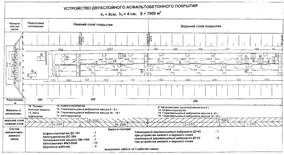 Окончательное число проходов катка по одному следу определяется по результатам пробного уплотнения. Уплотнение смеси ведут от краев покрытия к оси с перекрытием полосы уплотнения на 20...30 см. Для уплотнения смесей применяют самоходные гладковальцовые, пневмоколесные, вибрационные и комбинированные катки массой от 6 до 18 т. Оптимальный состав уплотняющего звена: один легкий (масса 6...8 т) и два-три тяжелых (масса 10...18 т) катка на каждый асфальтоукладчик или на один АБЗ производительностью 50...70 т/ч. Технология укладки смеси, недостатки и способы их устранения при строительстве асфальтобетонных покрытий изложены в табл. 59, 60, на рис. 16. Таблица 59 Технология строительства двухслойного асфальтобетонного покрытия