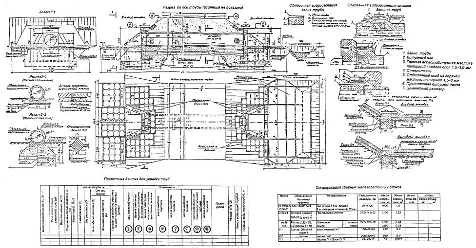 Прямоугольные трубы Прямоугольные железобетонные трубы устраивают, как правило, для пропуска значительного объема паводковой воды и при высоте насыпи более 5 м. Трубы сооружаются на сборных или монолитных фундаментах по слою цементного раствора толщиной 2 см. Входной оголовок устраивают на длине 3 м раструбным (повышенным на 0,5 м), а выходной - нормальным. На трубах с безнапорным режимом работы входной оголовок может устраиваться нормальным. Металлические трубы Металлические трубы по форме сечения применяют круглые, эллиптические, арочные и овоидальные. Круглые металлические трубы отверстием 1,0...2,0 м устраивают из волнистых листов с гофрами (130×32,5 мм). Лотки в трубах выполняются из монолитного бетона или асфальтобетона высотой выше гофра на 2 см. Трубы из полимерных материалов Такие трубы обладают хорошей химической стойкостью и водонепроницаемостью. Трубы изготавливаются из полиэфирного стеклопластика, фурфуролацетонового полимербетона и поливинилхлорида (винипласт). Трубы из полимерных материалов, обладающие достаточной прочностью, стойкостью к агрессивным средам, низкой трудоемкостью, должны найти широкое применение в строительстве автомобильных дорог. Недостаток таких труб - старение, которое в настоящее время недостаточно изучено. 4.2. Строительство железобетонных трубПодготовительные работы на базе предприятия (рекомендации). 1. Проверка элементов труб на допускаемые отклонения по ГОСТу (длина звена - 0...10 мм, толщина стенок -5...+10 мм, остальные измерения ±10 мм). 2. Удаление наплывов, набрызга бетона на сочленяемых частях звеньев. 3. Подбор всех элементов трубы по маркам согласно проектному решению. 4. Нанесение обмазочной гидроизоляции на звенья труб, на одну из сторон портала и откосных крыльев, соприкасающихся с землей: нанесение горячего битумного лака; нанесение слоя битумной мастики толщиной 1,5...3,0 мм; нанесение второго слоя битумной мастики толщиной 1,5...3,0 мм; сушка каждого слоя до остывания. 5. Складирование элементов трубы в одном месте. Обмазочная гидроизоляция наносится горячим лаком и горячей мастикой передвижным распылительным агрегатом со сменными соплами или вручную шпателем, кистями. Каждый последующий слой наносится по остывшему предыдущему слою гидроизоляции. Подготовительная работа на месте строительства 1. Выбор и подготовка площадки строительства. Корчевка кустарника, планировка площадки бульдозером. 2. Прием и размещение оборудования, материала и конструкций. 3. Разбивка оси трубы и контура котлована. 4. Выноска высотных отметок. 5. Проведение мероприятий по ограждению котлована от воды. Исполнительные работы 1. Рытье котлована экскаватором и зачистка его вручную. Укрепление (при необходимости) дна котлована каменными материалами путем вдавливания средствами уплотнения. 2. Устройство гравийно-песчаной подготовки. Уплотнение ПГС малогабаритным виброкатком или механическими трамбовками. 4. (9). Монтаж автокраном (10...16 т) портальной стенки и откосных крыльев выходного (входного) оголовка. Засыпка ПГС портальной стенки и площади фундамента под отметку. Уплотнение ПГС малогабаритным катком (механической трамбовкой). Проверка отметок основания фундамента по нивелиру. 5. Монтаж автокраном (10...16 т) блоков фундамента с оставлением разрывов под раструбы звеньев труб. Проверка нивелиром уклона фунда