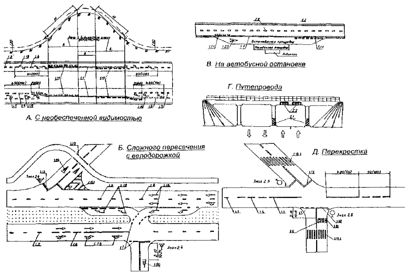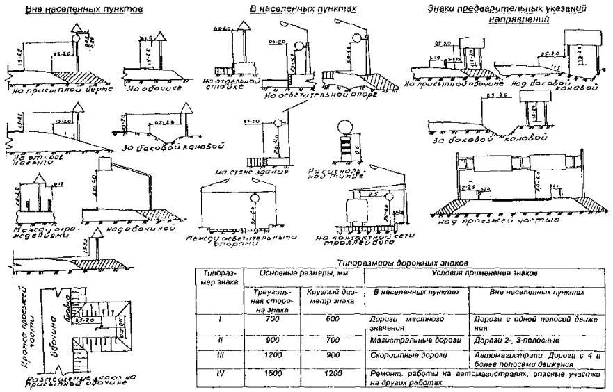 в пределах кривых сопряжения на пересечениях и примыканиях дорог в одном уровне на расстояниях для внешней стороны кривых; на дорогах, расположенных на расстоянии до 15 м от болот и водотоков глубиной от 1,0 до 2,0 м, через каждые 10 м; у мостовых сооружений длиной до 10 м по 3 столбика с каждой стороны через 10 м; у водопропускных труб - по 2 столбика с каждой стороны дороги до трубы и после нее на расстоянии 5,0 м от ее оси. Сигнальные столбики следует устанавливать на бровке земляного полотна высотой 0,75...0,80 м над обочиной. Дорожные знаки Дорожные знаки подразделяются на: предупреждающие; знаки приоритета; запрещающие; предписывающие; информационно-указательные; знаки сервиса; знаки дополнительной информации. В знаки сервиса по ГОСТ Р51582-2000 введены дорожные знаки 6.13. «Пункт контроля международных перевозок» и 6.14. «Пост дорожно-патрульной службы». Действие знака распространяется на проезжую часть, велосипедную или пешеходную дорожку, у которой или над которой он установлен. В одном поперечном сечении дороги допускается устанавливать не более 3 знаков, без учета дублирующих и знаков дополнительной информации. Знаки, установленные на дороге последовательно, за исключением знаков на перекрестке, должны располагаться вне населенных пунктов на расстоянии не менее 50 м, а в населенных пунктах - не менее 25 м друг от друга. Дорожные знаки, как правило, устанавливаются с правой стороны дороги вне проезжей части и обочин. Расстояние от кромки проезжей части, а при наличии обочины - от бровки земляного полотна до ближайшего к ней края знака, установленного сбоку от проезжей части, должно быть от 0,5 до 2,0 м, а до края информационно-указательных знаков 5.20.1, 5.21.1, 5.27, 5.31 - от 0,5 до 5,0 м. В стесненных условиях допускается установка знаков на обочинах. При этом расстояние между кромкой проезжей части и ближайшим к ней краем знака должно составлять не менее 1,0 м, а высота установки - не менее 2,0 м. Расстояние от нижнего края знака, кроме предупреждающих знаков, знаков 1.4.1...1.4.6. и табличек, до поверхности дорожного покрытия, кроме случаев, специально оговоренных в ГОСТ 23457-86, должно быть: от 1,5 до 2,2 м - при установке сбоку от дороги вне населенных пунктов и от 2,0 до 4,0 м - в населенных пунктах; не менее 0,6 м - при установке на островках безопасности и на проезжей части дороги; от 5,0 до 6,0 м - при размещении знаков на пролетных строениях искусственных сооружений. На расстоянии менее 5,0 м от поверхности дорожного покрытия до низа пролетного строения знаки не должны выступать за его нижний край. Высота установки знаков определяется от кромки дорожной одежды. При расположении знаков друг над другом высота установки определяется по нижнему знаку, а расстояние между ними - от 50 до 200 мм. Высота установки знаков на протяжении всей дороги должна быть одинаковой, желательно 2,0 м, кроме знаков, расположенных над проезжей частью и на островках безопасности. Предупреждающие знаки, кроме 1.3.1...1.4.6, 1.31.1...1.31.3, в зависимости от скорости движения и условий видимости, устанавливаются на расстоянии 150...300 м, а в населенных пунктах - 50...100 м от начала опасных участков. Знак 1.6 «Пересечение равнозначных дорог» должен помещаться перед пересечением равнозначных дорог на расстоянии менее 150 м, а в населенных пунктах - менее 50 м. Знаки приоритета 2.3.1...2.3.3 устанавливаются на расстоянии 150...300 м от перекрестка.
