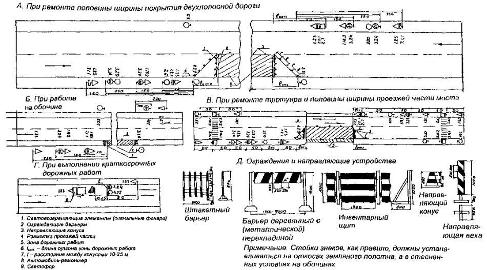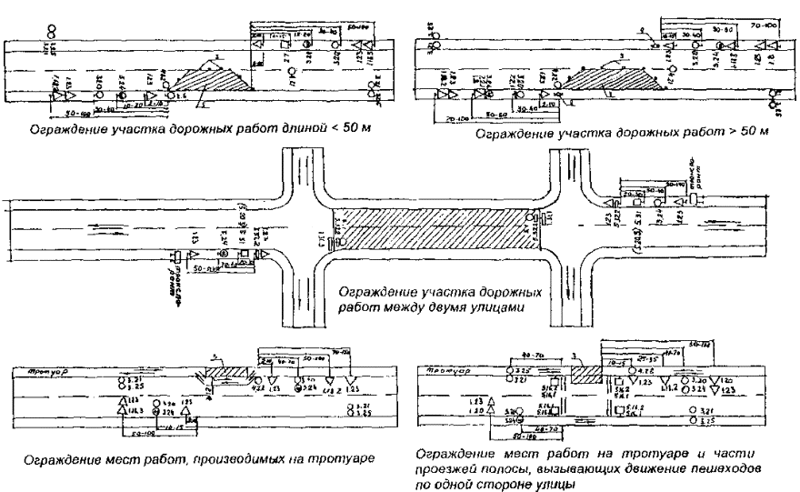 При выполнении ремонтных работ на тротуаре и половине ширины моста, кроме дорожных знаков, щитов и конусов, устраивают временные пешеходные переходы. В целях уменьшения потерь времени от снижения скорости следует обеспечивать на всем протяжении объезда скорость движения транспорта 60 км/ч, в стесненных условиях - не менее 40 км/ч. При устройстве объезда зоны дорожных работ устанавливается знак «Схема объезда» за 100...300 м до начала объезда. Ширина однополосного объезда принимается не менее 3,5 м, а с двухсторонним движением - не менее 6,0 м. Въезд и выезд с основной дороги должны располагаться не ближе 25 м от зоны дорожных работ. Радиусы горизонтальных кривых на объезде должны быть не менее 30 м, а в местах примыкания к основной дороге - не менее 15 м. Продольные уклоны объезда не должны превышать 100 ‰, а на участках въезда и съезда - 60 ‰. При краткосрочных работах, вызывающих сужение проезжей части, необходимо применять знаки 4.22 и 3.24, устанавливаемые на ограждающем барьере, а также два знака 1.23, один из которых закрепляется на передней части автомобиля-ремонтера, а второй устанавливают за 50 м до зоны ремонтных работ. Временные дорожные знаки устанавливаются, как правило, на переносных опорах, ограждающих щитах, барьерах. Нижний край знака должен находиться на высоте не менее 10 см от покрытия или земли. В плане дорожные знаки надо размещать не ближе 0,50 м от края проезжей части. Дорожные знаки или группы знаков располагают друг от друга на расстоянии не менее 50 м. Первым по ходу движения транспорта располагают знак 1.23, который с табличкой 7.2.1 должен повторяться не менее чем за 50 м до начала дорожных работ. В населенных пунктах и стесненных условиях повторный знак 1.23 с табличкой 7.2.1 можно устанавливать непосредственно у начала места дорожных работ. За пределами участка проведения дорожных работ устанавливают знаки 3.21, 3.25 (3.31). Другие временные дорожные знаки устанавливаются в соответствии с требованиями ГОСТ 23457-86. Ограждающие средства (барьеры, щиты, конуса и т.д.) и вспомогательное оборудование (шнуры с красными флажками, фонари, переносные светофоры) являются переносными элементами организации движения на участках дорожных работ. Барьеры устанавливаются главным образом поперек проезжей части за 5...10 м до границы дорожных работ с обеих сторон, для того чтобы закрыть движение полностью или по одной стороне проезжей части. Направляющие конусы изготавливаются из листовой стали или резины. Сигнальные шнуры прикрепляют к барьерам, вехам на высоте не менее 0,80 м над поверхностью дороги. Все ограждающие устройства, кроме сигнального флажка, окрашиваются в красный и белый цвета. Постоянные дорожные знаки и существующая разметка, если они противоречат целям организации движения на период ремонта, должны быть ликвидированы и восстановлены только после ремонтных работ. Дорожные машины должны быть окрашены в ярко-желтый цвет с нанесенными полосами красного цвета на габаритных частях. На темное время суток неработающая техника должна быть убрана за пределы земляного полотна или ограждена барьерами с желтыми сигнальными фонарями на удалении 10...15 м от машин. Рабочие, выполняющие дорожные работы, должны быть одеты в жилеты ярко-оранжевого цвета. Особенности ограждения мест производства работ в условиях дорожного движения в городах На проведение 