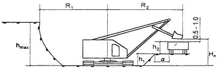 R1 - максимальный радиус, м; R2 - максимальный радиус резания, м; hmax - наибольшая высота забоя, м; h2 - высота транспортных средств, м; h1 - высота площадки, м; а - расстояние от края площадки до крайнего колеса (ориентировочно а = 1,0 м при связных грунтах и а = 1,5 м при песчаных грунтах). Таблица 81 Технические характеристики экскаваторов