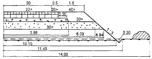 Примечания: 1. Толщину конструктивного слоя следует принимать во всех случаях не менее 1,5 размера наиболее крупной фракции применяемого минерального материала. 2. При укладке каменного материала на глинистые и суглинистые грунты следует предусматривать прослойку толщиной не менее 10 см из песка, высевок, укрепленного грунта и других водоустойчивых материалов. Дорожные одежды с асфальтобетонным покрытием устраивают в общем потоке строительства специализированные подразделения, а при малых объемах работ - оптимальные механизированные звенья после сооружения земляного полотна по схеме: Устройство дополнительного слоя; Устройство основания; Устройство покрытия; Поверхностная обработка. 3.3. Дополнительный слой основанияДополнительный слой устраивается из несвязных дренирующих материалов с коэффициентом фильтрации не менее 1 м/сут. и укладывается на уплотненное спрофилированное с уклоном 20...40 ‰ земляное полотно. Для устройства дополнительного слоя применяется песок, песчано-гравийная смесь, шлак доменный сталеплавильный и щебень шлаковый (рис. 14, табл. 45). Таблица 45 Технология устройства дополнительного слоя основания из различных материалов