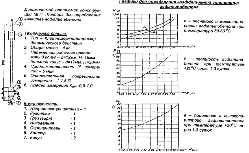 Дополнительные требования к укладке асфальтобетонной смеси при отрицательной температуре воздуха 1. Очистка основания механической щеткой без применения воды. 2. Непрерывный подвоз смеси в утепленных кузовах автосамосвалов, чтобы не допустить остановку асфальтоукладчика. 3. Температура смеси при укладке должна быть не ниже 160 °С, а при уплотнении 130 °С. 4. Приготовление смеси с добавками ПАВ или активированным минеральным порошком. 5. Уплотнение смеси тяжелыми катками на пневмоходу или виброкатками со скоростью не более 2 км/ч и увеличением числа проходов - на 20...30 %. 6. Подогрев основания (нижнего слоя покрытия) разогревателями типа КР-53А, РАИ О, ДЭ-2 или другими средствами. 7. Толщина слоя укладки смеси должна быть не менее 4 см. 8. Тщательная заделка продольных и поперечных швов путем дополнительного прогрева горячими утюгами или выносными линейками с горелками разогревателей асфальтобетона. 9. Укладка теплых и горячих смесей при температуре воздуха не ниже 0 °С и скорости ветра не более 7 м/с. 10. Асфальтобетонная смесь должна иметь минимальный показатель по водонасыщению. 11. Асфальтоукладчик должен иметь выглаживающую плиту с исправным агрегатом нагрева. 12. Техника должна быть подготовлена для работы в зимних условиях. Коэффициент уплотнения для асфальтобетона должен быть не ниже: 0,99 - для плотного асфальтобетона из горячих смесей типа А, Б; 0,98 - для плотного асфальтобетона из горячих смесей типа В, Г, Д, пористого и высокопористого асфальтобетона; 0,97 - для асфальтобетона из холодных смесей. Линейный контроль за коэффициентом уплотнения в период укатки смеси следует производить приборами: динаметрическим плотномером конструкции МГП «Кондор» (прил. 4, рис. 28); пористомером асфальтобетона КП-209М (прил. 4, рис. 29). Контроль качества работ 1. При приготовлении асфальтобетонной смеси проверяют: постоянно - температуру битума и минеральных материалов, температуру готовой смеси в кузове каждого автомобиля; не реже одного раза в смену - качество смеси по ГОСТ 9128-97 и битума по ГОСТ 11501-78 и ГОСТ 11503-74; качество щебня, песка, минерального порошка не реже одного раза в 10 смен. 2. В процессе строительства покрытия проверяют: поперечные уклоны покрытия; ровность покрытия в 5 контрольных точках; температуру асфальтобетонной смеси в кузове каждого прибывающего самосвала; постоянно - качество продольных и поперечных швов укладываемых полос; качество асфальтобетона по показателям кернов (вырубок), взятых в 3 местах на площади покрытия 7000 м2. Вырубки следует отбирать в каждом слое из горячего асфальтобетона через 1...3 суток, из холодного асфальтобетона - через 15...30 суток на расстоянии не менее 1,0 м от края покрытия. 3.6. Поверхностная обработка покрытияПоверхностная обработка - это технологический процесс сооружения слоев износа замыкающего слоя покрытия или создание шероховатой поверхности путем розлива вязкого битума и россыпи по нему прочных каменных материалов размерами 5...25 мм. Одиночная поверхностная обработка устраивается на покрытиях из асфальтобетонной смеси типов В и Д всех марок, типов Б и Г марок II и III, а также на покрытиях, устраиваемых по методу пропитки или из грунтов, обработанных органическими (неорганическими) вяжущими материалами. Поверхностная обработка выполняется по чистому, сухому и незапыленному покрытию при температуре воздуха