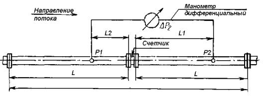 DР2 - потеря давления на участках трубопровода вверх и вниз по потоку и на счетчике: DР2 = (DРL2 + DPL1+DPсч); DР2 - DP1 = (DРL2 + DPL1+ DPсч) - (DРL2 + DPL1) = DPсч Черт. 4 7.3.2. Определение потери давления, вызванной длиной труб (измерение 1) Перепад давления в трубах вверх и вниз по потоку ∆P1 можно определить перед самыми испытаниями и периодически проверять. Для этого верхнюю и нижнюю трубы соединяют вместе без счетчика (при этом следует избегать несоосности двух соединяемых труб и выступа соединения в канал трубы) и измеряют перепад давления на измерительном участке для каждого расхода. Отсутствие счетчика укорачивает измерительный участок. Если испытательная установка не имеет раздвижных участков труб, то оставшееся пространство можно восполнить, установив в нижней части измерительного участка временную трубу такой же длины и такого же диаметра или установив в этом промежутке счетчик воды. 7.3.3. Измерение и расчет действительного ∆P счетчика воды (измерение 2). Перепад давления ∆Р2 на измерительном участке измеряют при тех же расходах, которые используют для определения перепада давления в трубе, с применением той же установки, тех же отверстий для отбора давления и манометра, но с установленным счетчиком воды. Примечание: Если расходы при наличии счетчика и без него различны, то полученные значения перепадов следует привести к одному значению расхода с помощью закона квадратов (п. 10.2.2.5) Действительную потерю давления ∆Р на счетчике при данном расходе определяют путем вычитания: ∆Р = ∆Р2 - ∆Р1. Полученное значение может быть преобразовано в потерю давления, соответствующую qmax счетчика воды, используя формулу, приведенную в п. 10.2.2.5. Максимальная относительная погрешность результатов измерения потери давления не должна превышать ±5 %. 8. ИСПЫТАНИЯ НА УСКОРЕННЫЙ ИЗНОС8.1. Испытания при постоянном расходе 8.1.1. Общие положения Метод заключается в испытании счетчика на постоянных расходах. Для большего удобства работы лабораторий испытания могут быть разделены на периоды по 6 ч. 8.1.2. Описание установки Установка состоит из: а) устройства подачи воды (магистральный трубопровод, негерметизированный резервуар, герметизированный резервуар, насос и т.д.); б) трубной обвязки. 8.1.3. Трубная обвязка 8.1.3.1. Описание Кроме испытуемого счетчика (счетчиков), трубная обвязка содержит: а) устройство регулирования потока; б) устройство измерения температуры воды на входе счетчика; в) один или несколько клапанов; г) средства регулирования расхода и продолжительности испытания. Если трубопровод заканчивается на открытом воздухе, то точку выхода на открытый воздух следует располагать, на более высоком уровне, чем высшая точка счетчика. Различные устройства не должны создавать явление кавитации. 8.1.3.2. Принимаемые меры предосторожности. Соединительные трубы и счетчик должны быть соответственным образом освобождены от воздуха. 8.1.4. Допустимое отклонение расхода. Расход следует поддерживать постоянным в течение всего испытания на заданном уровне. Относительное отклонение значений расхода не должно превышать плюс 10 % во время каждого испытания (кроме момента пуска и остановки). 8.1.5. Допустимая продолжительность испытания. Заданная продолжительность испытания - минимальная. 8.1.6. Допустимое значение объема. Показание объема в конце испытания должно быть не меньше значения, о