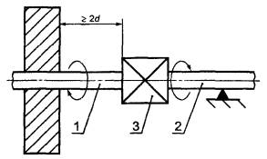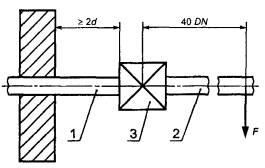Регуляторы с компрессионными фитингами испытывают изгибающим моментом через переходную деталь, ввернутую в соединение. 8.4.2 Испытание регуляторов групп 1 и 2 с резьбовыми соединениями кутящим моментом в течение 10 с. Сборочный узел для испытаний крутящим моментом - в соответствии с рисунком 1. d - внешний диаметр трубы; 1 - труба 1; 2 - труба 2; 3 - испытуемый регулятор Рисунок 1 - Сборочный узел для испытаний крутящим моментом Испытания проводить в следующей последовательности: а) трубу 1 заворачивают в регулятор крутящим моментом, не превышающим значений, приведенных в таблице 3. Трубу 1 закрепляют на расстоянии не менее 2d от регулятора (рисунок 1); б) трубу 2 заворачивают в регулятор крутящим моментом, не превышающим значений, приведенных в таблице 7. Соединения должны быть герметичны; в) опору трубы 2 выполняют так, чтобы изгибающий момент не передавался на регулятор; г) к трубе 2 прикладывают крутящий момент в течение 10 с, постепенно повышая его, не превышая значений, приведенных в таблице 3. Последние 10 % крутящего момента прикладывают в течение 1 мин; д) снимают крутящий момент и визуально проверяют собранный монтажный узел на наличие деформации, затем испытывают собранный узел на внешнюю герметичность по 8.3.2; е) если оси входного и выходного отверстий не совпадают, испытания повторяют с перевернутыми соединениями. 8.4.3.1 Компрессионные соединения с овальными вкладышами Для испытания используют стальную трубу с новым медным вкладышем, соответствующим размеру трубы. Испытания проводят в следующей последовательности: а) корпус регулятора закрепляют неподвижно и к каждой гайке трубопровода прикладывают в течение 10 с испытательный крутящий момент по таблице 3; б) эту же процедуру повторяют для всех соединений; в) проверяют регулятор на наличие деформации, не принимая во внимание деформацию места установки вкладыша или сопряженных с ним поверхностей от приложенного крутящего момента, затем испытывают регулятор на внешнюю герметичность по 8.3.2. 8.4.3.2 Компрессионные соединения с коническими вкладышами Испытания проводят по 8.4.3.1, используя короткую стальную трубу с коническим концом. Деформацию места установки конического вкладыша или сопряженных с ним поверхностей от приложенного крутящего момента не учитывают. 8.4.4 Испытания изгибающим моментом 8.4.4.1 Испытания регуляторов групп 1 и 2 изгибающим моментом в течение 10 с Испытания проводят на том же регуляторе, что и испытания крутящим моментом, сборочный узел - в соответствии с рисунком 2. Испытания проводят в следующей последовательности: а) на расстоянии 40 DN от центра регулятора в течение 10 с прилагают силу, необходимую для получения изгибающего момента для регуляторов групп 1 или 2 и приведенную в таблице 3, учитывая при этом массу трубы; б) снимают приложенную нагрузку и визуально проверяют сборочный узел на наличие остаточной деформации, затем испытывают сборочный узел на внешнюю герметичность по 8.3.2, утечки не должны превышать значений, приведенных в таблице 2; в) если оси входного и выходного отверстий не совпадают, испытания должны быть повторены с перевернутыми соединениями. 8.4.4.2 Испытания регуляторов группы 1 изгибающим моментом в течение 900 с Испытания проводят в следующей последовательности: d - внешний диаметр трубы; 1 - труба 1; 2 - труба 2; 3 - испытуемый регулятор Рисунок 2 - Сборочный