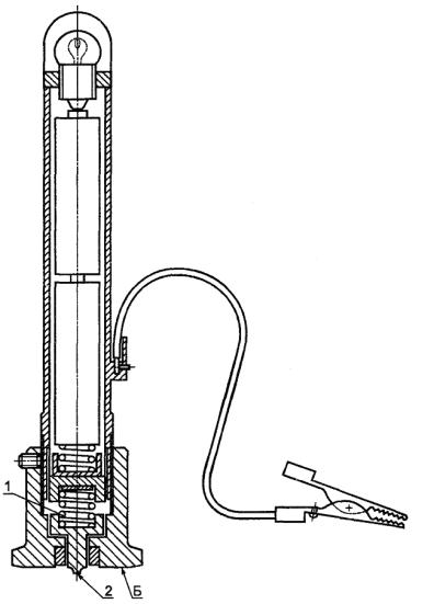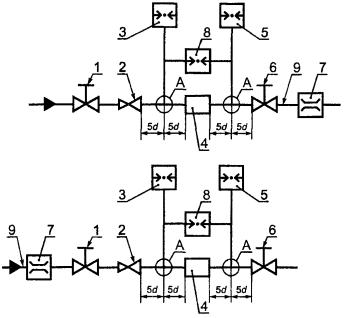 где т1 - масса испытуемого образца в воздухе до погружения в пентан, г; m5 - масса испытуемого образца в воздухе после сушки, г. Стойкость маркировки (5.1) испытывают по ГОСТ МЭК 730-1, приложение А. Поверхность Б устройства для испытания царапаньем (рисунок 3) плотно прижать к окрашенной поверхности. Провести зафиксированным стальным шариком диаметром 1 мм по поверхности со скоростью от 30 до 40 мм/с, с усилием контакта 10 Н. Повторить испытание царапанием после испытания на влагостойкость. 8.5.4 Испытание на влагостойкость Регулятор помещают в климатическую камеру при температуре (40 ± 2) °С и относительной влажности более 95 % на 48 ч. Удалить регулятор из климатической камеры и осмотреть его невооруженным глазом на наличие признаков коррозии. Отслоения или вспучивания покрытия на поверхности не допускаются. Регулятор выдержать в течение 24 ч при окружающей температуре по 8.1.1, затем повторить осмотр. Б - поверхность испытуемого устройства; 1 - пружина с усилием нагрузки 10 Н; 2 - наконечник, которым проводится царапанье (стальная сфера диаметром 1 мм); Рисунок 3 - Устройство для испытания царапаньем 8.6 Характеристики регулятора8.6.1 Аппаратура Испытания должны быть выполнены на стенде, оборудованном аппаратурой в соответствии с рисунком 4. 1, 6 - ручные регулирующие краны; 2 - регулятор давления на входе; 3 - манометр для измерения давления на входе; 4 - испытуемый образец; 5 - манометр для измерения давления на выходе; 7 - расходомер; 8 - дифференциальный манометр; 9 - прибор для измерения температуры в точке