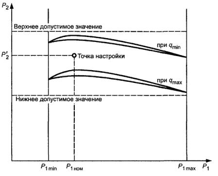где qn - откорректированное значение расхода воздуха при нормальных условиях, м3/ч; q - измеренное значение расхода воздуха, м3/ч; Р - испытательное давление, кПа; Pа - атмосферное давление, кПа; t - температура воздуха, °С. Характеристики должны быть выражены в кубических метрах в час воздуха при стандартных условиях. 8.6.3 Испытательные процедуры 8.6.3.1 Общие условия Регуляторы классов А, В и С должны быть испытаны в соответствии с 8.6.3.2 - 8.6.3.4 в последовательности, приведенной в приложении Д. Прежде чем измерить характеристики регулятор должен достигнуть теплового равновесия с окружающей средой. Примеры характеристик кривых с Р2 (как ордината) и Р1 (как абсцисса) с переменным давлением на входе показаны на рисунке 5 и с переменным расходом потока воздуха - на рисунке 6. Рисунок 5 - График зависимости давления на выходе от давления на входе Рисунок 6 - График зависимости давления на выходе от расхода воздуха Изменения давления на входе Р1 и расхода q выполнить следующим образом: а) настроить давление на выходе из регулятора: Краном на выходе регулятора установить расход воздуха, равным 0,5 qmax (или любой другой расход, указанный изготовителем). Для настраиваемых регуляторов отрегулировать давление на выходе, равное максимальному значению Р2тax, давление на входе P1 должно быть номинальным (или любым другим значением, указанным изготовителем). Отрегулированное давление на выходе агрегата не должно изменяться при дальнейшем изменении настроек регулятора; б) изменить давление на входе Р1 от минимума Р1min до максимума P1max и назад к минимуму Р1min при этом записывать давление на выходе Р2, по крайней мере, для пяти значений P1 в каждом направлении, без повторной регулировки расходы воздуха; в) при постоянном давлении на входе Р1min уменьшить расход воздуха от qmax до qmin и затем увеличить до qтах, используя для этого кран на выходе регулятора. Записать давление на выходе Р2, по крайней мере, для пяти значений расхода воздуха q в каждом направлении. Необходимо удостовериться, что во время испытаний давление воздуха на входе не изменяется; г) изменить давление на входе от Р1min до P1max при изменении расхода от qmax до qmin, повторить испытания по перечислению в); д) для настраиваемых регуляторов установить давление на выходе Р2min расходе воздуха согласно перечислению а). Повторить испытания по перечислениям б) - г). 8.6.3.3 Регуляторы класса В Изменение давления на входе Р1 и расхода q выполняется следующим образом: а) краном на выходе регулятора установить расхода воздуха qmax. Для настраиваемых регуляторов отрегулировать максимальное значение давления на выходе Р2mах, при этом давление на входе P1 должно равняться номинальному значению давления (или другому значению, заявленному изготовителем). Отрегулированное давление на выходе из регулятора не должно изменяться при дальнейшей настройке регулятора; б) изменить давление на входе Р1 от минимума Р1min до максимума P1max и назад к минимуму Р1min, при этом записывать давление на выходе Р2, по крайней мере, для пяти значений Р1 в каждом направлении, без повторной регулировки расхода воздуха; в) краном на выходе регулятора установить расход воздуха, равный максимальному значению qmax, при постоянном давлении на входе P1min без регулировки давления на выходе при qmin; г) повторить испытания по перечислению б); д) для настраиваемых регуляторов устан