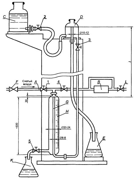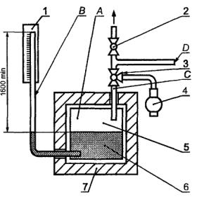 1 - всасывающая трубка (сапун); 2 - нагрузка; 3 - главная мембрана; 4 - седло клапана; 5 - шток клапана; 6 - хвостовик клапана; 7 - компенсационная мембрана; 8 - пружина; 9 - пластина мембраны Рисунок А.1 - Типы регуляторов постоянного давления (схематические) ПРИЛОЖЕНИЕ Б(рекомендуемое) Испытание на герметичность (волюметрический метод)Б.1 Аппаратура Схема аппарата для испытания на герметичность, приведена на рисунке Б.1 А - вход; В - испытуемый образец; С - емкость с водой; D - сосуд с постоянным уровнем воды; Е, К - переливной сосуд; F - регулятор; G - трубка; Н - измерительная бюретка; L - клапан выхода; 1 - 5 ручные краны Рисунок Б.1 - Аппаратура для испытания на герметичность (волюметрическим методом) Аппаратура должна быть выполнена из стекла. Краны 1-5 выполняют из стекла, они должны быть нагружены пружиной. В качестве рабочей жидкости используется вода. Расстояние l между уровнем воды в сосуде с постоянным уровнем и концом измерительной трубки G регулируют так, чтобы эта высота столба воды колонки соответствовала испытательному давлению. Испытательную аппаратуру устанавливают в помещение. Б.2 Проведение испытаний Давление сжатого воздуха на входе перед краном 1 регулируют до испытательного давления посредством регулятора давления F. Краны 1 - 5 закрывают. Подсоединяют испытуемый образец В к испытательной аппаратуре. Закрывают клапан на выходе L. Открывают кран 2 и снова закрывают его, когда вода в сосуде с постоянным уровнем D начнет переливаться в сосуд Е. Открывают краны 1 и 4. Закрывают кран 1, когда измерительная бюретка H и клапан в испытуемом образце В находятся под давлением. Открывают кран 3. Ждут приблизительно 15 мин, чтобы воздух в испытательной аппаратуре и испытуемом образце достиг теплового равновесия. Любую утечку определяют количеством воды, перетекающей из трубки G в измерительную бюретку Н. ПРИЛОЖЕНИЕ В(рекомендуемое) Испытание на герметичность (метод падения давления)В.1 Аппаратура для испытаний на герметичность Аппарат показан схематично на рисунке В.1. А - теплоизолированный сосуд давления; В - измерительная трубка; С - трубка под давлением; D - соединение с испытываемым клапаном; 1 - шкала; 2 - вентиль; 3 - трехходовой кран; 4 - компрессор; 5 - воздушная полость объемом 1 дм3; 6 - вода; 7 - теплоизоляция Рисунок В.1 - Аппаратура для испытания на герметичность методом падения давления Аппарат состоит из теплоизолированного сосуда давления А, заполненного водой так, чтобы объем воздуха над водой составлял 1 дм3. Стеклянную трубку В внутреннего диаметра 5 мм, открытую сверху одним концом, помещают в воду в сосуде А. Эта трубка служит для измерения падения давления. Испытательное давление подводят ко второй трубке С, соединенной с воздушной полостью сосуда давления А, с которым испытуемый образец соединен через отвод D посредством гибкого шланга длиной 1 м, внутренним диаметром 5 мм. В.2 Метод испытаний Регулятором устанавливают значение давления воздуха в сосуде давления А через трехходовой кран 1 до испытательного. Повышение уровня воды в измерительной трубке В соответствует испытательному давлению. Открывают трехходовой кран 3 для соединения испытуемого регулятора через соединение D с сосудом давления А. Ждут 10 мин, чтобы установилось тепловое равновесие. Затем ждут еще 5 мин и снимают показания падения давления непосредственно в измеряющей трубке 