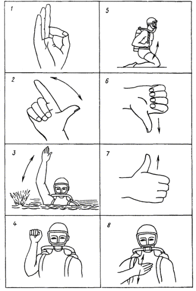 Опасность! Прошу немедленную помощь! (указательным пальцем левой руки указывает на причину плохого самочувствия или неисправности снаряжения). Правая ладонь с поднятым пальцем несколько раз быстро прижимается к шее. |