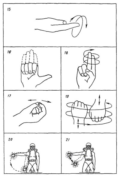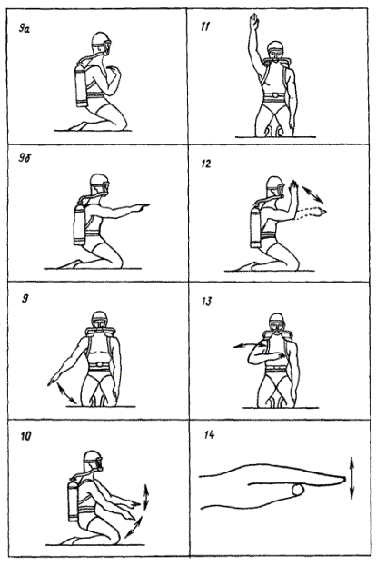 Внимание! Стоп! (Вслед за этим сигналом следует другой. Если водолазы что-то делали под водой, подача сигнала требует прекращения действия. Если от водолазов что-то требовали, подача им этого сигнала означает отказ). Руку с распластанной ладонью (пальцы вместе) поднимают вертикально вверх. |