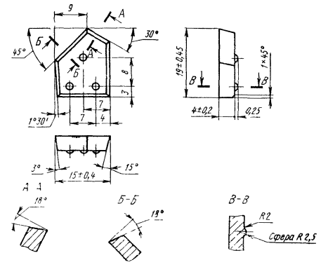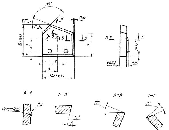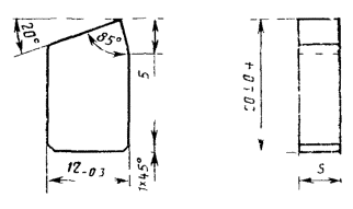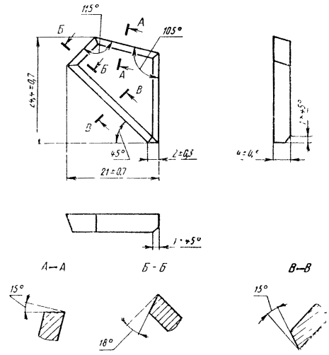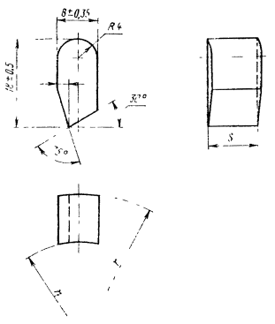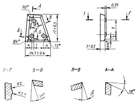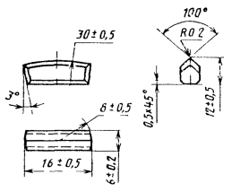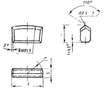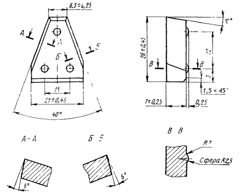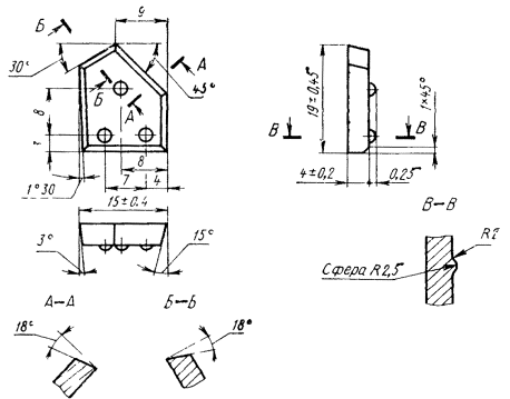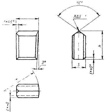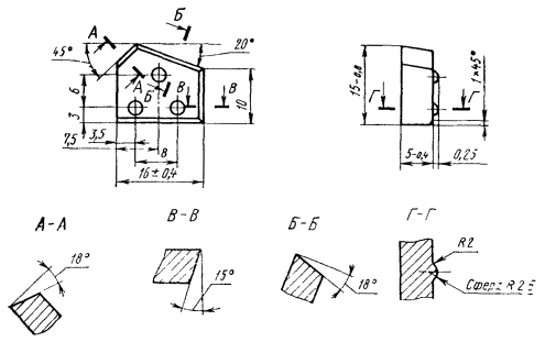 размеров - по (Измененная редакция, Изм. № 1). 4. Неуказанные предельные отклонения углов изделий не должны превышать для углов: до 5° + 1°; св. 5° до 15° ± 1°; св. 15° ± 2°. 5. Углы, радиусы, фаски и неоговоренные допусками размеры изделий форм Г24, Г24а, Г25, Г26 и Г67 даны для построения прессового инструмента и на готовых изделиях не контролируются. (Измененная редакция, Изм. № 2). 6. По заказу потребителя изделия форм Г23, Г25, Г26 и Г54 должны изготовляться в шлифованном виде по нормативно-технической документации. 7. По заказу потребителя допускается изготовление изделий форм Г34, Г34а, Г36, Г37 задними углами 25°. (Измененная редакция, Изм. № 2). 8. На изделиях Г2601 - Г2605 допускается наличие заусенцев до 0,3 мм. 9. Если изделия форм Г11, Г12, Г13, Г14, Г23, Г24 и Г65 поставляются потребителям партией 30 - 50 тыс. шт., то отклонение размеров по толщине или диаметру в пределах поставляемой партии не должно превышать 0,1 мм. На изделии формы Г65 размер Æ 14+0,3 мм контролируют на цилиндрической части изделия от его основания до начала клиновой поверхности. (Измененная редакция, Изм. № 1). 10. Изделия должны изготовляться из твердого сплава по ГОСТ 3882-74. По заказу потребителя допускается изготовлять изделия форм Г11, Г12, Г13, Г14 из твердого сплава марки ВК10-КС по ТУ 48-19-367-83. (Измененная редакция, Изм. № 4). 11. Технические требования - по ГОСТ 4411-79. 12. Ориентировочная масса изделий приведена в приложении 1. ПРИЛОЖЕНИЕ 1