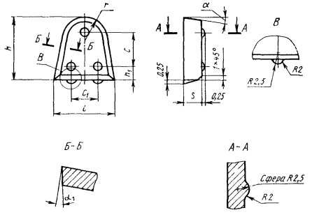 * Табл. 20 исключена. Условное обозначение изделий для горного инструмента при заказе составляется с учетом Общесоюзного классификатора продукции (ОКП). Полный код ОКП изделий для горного инструмента состоит из 15 (16) знаков: первые десять знаков приведены в приложении 2, последние 5 (6) знаков - номер изделия для горного инструмента - приведены в табл. 2 - 21. Пример условного обозначения изделия формы Г11 из твердого сплава марки ВК8-В, размерами l = 28 мм, h = 16 мм, s = 7,5 мм, r = 14 мм при заказе: 19 6533 2852 Г1101 ГОСТ 880-75 в технической документации: Изделие формы Г1101 ВК8-В ГОСТ 880-75. То же, для изделия формы Г24а с размерами h = 16 мм, l = 13 мм, s = 4 мм, r = 4,5 мм, h1 = 3 мм, С = 9 мм, С1 = 6 мм, a = 10°, a1 = 3° при заказе: 19 6533 2859 Г24а-02 ГОСТ 880-75 в технической документации: Изделие формы Г24а: Г24а-02 ВК8-В ГОСТ 880-75. (Измененная редакция, Изм. № 1, 2, 4). 3. Неуказанные предельные отклонения линейных