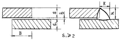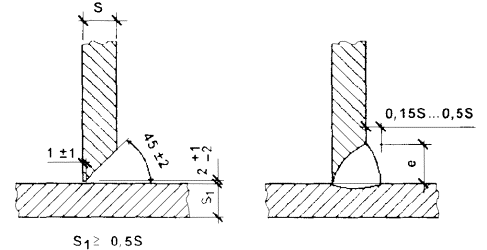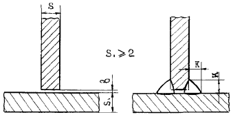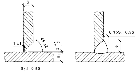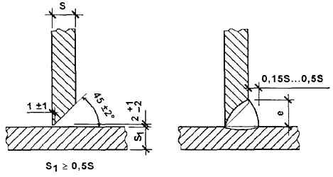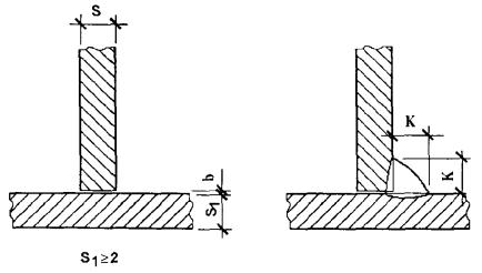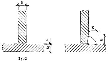 Величина катета углового шва К должна быть установлена при проектировании сварного соединения, но не более 3 мм для деталей толщиной до 3 мм включительно, и 1,2 толщины более тонкой детали при сварке деталей толщиной свыше 3 мм. Предельные отклонения катетов углового шва К от номинального значения должны соответствовать: + 1 мм - при К £ 5 мм; + 2 мм - при К ³ 6 мм