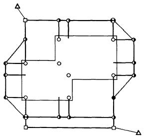 Точность определения отметки на монтажном горизонте относительно исходного, а также передачи точек по вертикали следует принимать согласно приложений 4 и 5 СНиП 3.01.03-84. Построение плановой внутренней разбивочной сети здания начинается с перенесения разбивочных осей на исходный горизонт, т.е. на блоки фундамента или перекрытия подвала. Выбор точек плановой разбивочной сети здания, принимаемых в качестве исходных для передачи на монтажные горизонты, определяется возможностью вертикального проектирования. Число опорных точек, передаваемых на монтажные горизонты, должно быть не менее трех. При переносе осей методом вертикального проектирования точки допускается закреплять вне корпуса здания и проектировать их по вертикали на площадки (палетки), укрепленные на выносных кронштейнах. При наклонном проектировании осей на монтажные горизонты разбивочная сеть создается на исходном горизонте таким образом, чтобы точки пересечения продольных и поперечных осей располагались как можно ближе к внешним габаритам здания. Базисные фигуры разбивочных сетей строятся на исходном горизонте так, чтобы по своей форме повторяли конфигурацию здания и состояли в основном, из типовых правильных геометрических фигур, стороны которых располагались бы параллельно осям здания так, чтобы разбивка осей выполнялась непосредственно линейными промерами вдоль сторон базисной фигуры или методом построения створов. Построение плановой разбивочной сети на исходном горизонте выполняется в следующем порядке: - построение основных (угловых) точек плановой сети; - проложение основного хода по исходным точкам (или измерение сторон и диагоналей при трилатерационных способах); - редуцирование основных точек плановой разбивочной сети; - контрольные измерения; построение промежуточных точек. Окончательно определенные точки внутренней разбивочной сети на исходном горизонте надежно закрепляются и маркируются несмываемой краской.