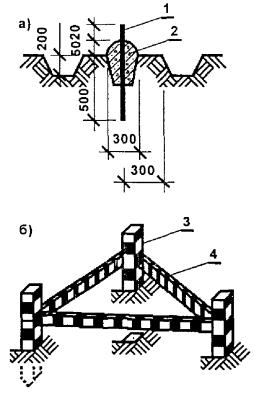 а) геодезический знак; б) ограждение знака 1 - металлический стержень Ø 16 мм; 2 - бетон класса В7,5; 3 - деревянный столб размером 1800 ´ 80 ´ 80 мм; 4 - доска размером 1500 ´ 80 ´ 80 мм или металлический уголок размером 25 ´ 25 ´ 2 мм ЗАКРЕПЛЕНИЕ ОСНОВНЫХ ИЛИ ГЛАВНЫХ РАЗБИВОЧНЫХ ОСЕЙ ЗДАНИЯ СВЫШЕ 5 ЭТАЖЕЙ, СООРУЖЕНИЯ ВЫСОТОЙ СВЫШЕ 15 М С ПРОДОЛЖИТЕЛЬНОСТЬЮ СТРОИТЕЛЬСТВА ДО 0,5 ГОДА