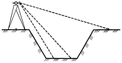 Контроль глубины разработки при помощи визирок выполняется в следующем порядке. За 2 - 3 м от верхней бровки котлована на противоположных его сторонах на одной отметке Нв, укрепляют две постоянные визирки. Длину l контрольной визирки рассчитывают по проектной отметке Но дна котлована и отметке верха постоянных визирок Нв, по формуле: l = Нв - Но Изготовив визирку расчетной длины l, периодически в процессе углубления котлована контролируют его глубину. Такой способ применяется при сравнительно неглубоких и нешироких котлованах. Если котлован имеет значительные размеры, то эффективным контролем глубины является тригонометрическое нивелирование. КОНТРОЛЬ ГЛУБИНЫ РАЗРАБОТКИ КОТЛОВАНА ПРИ ПОМОЩИ ТРИГОНОМЕТРИЧЕСКОГО НИВЕЛИРОВАНИЯ