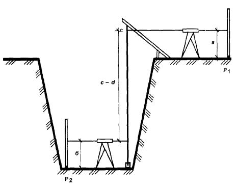 В глубоких котлованах на дне строят обноску на высоте 0,8 - 1,5 м над основанием котлована и на нее створными засечками передают основные оси со знаков их закрепления так же, как это делают на поверхности земли. Дальнейшую разбивку фундамента выполняют по обноске. В этом случае обноску на поверхности не строят. Основным способом точной передачи отметок в котлован является способ геометрического нивелирования. Если в результате постоянного контроля за выемкой грунта установлено, что до проектной отметки осталось в пределах 10 см, то выполняют точную передачу отметки в котлован. Перед этим на дне котлована закладывают не менее двух грунтовых временных реперов или марок. На бровке укрепляют кронштейн или наклонный брусок для подвеса рулетки. К нижнему концу рулетки подвешивают груз и опускают его в сосуд с жидкостью для предотвращения колебаний. Отметку передают с помощью одного переносного или двух нивелиров. На рабочий репер Р1 и на репер на дне котлована Р2 устанавливают рейки. Посередине между рулеткой и реперами устанавливают нивелир (или два нивелира). Берут отсчеты по рейкам а и б и одновременно отсчеты по рулетке с и d. Отметку репера Р2 вычисляют по формуле: Нр2 = Hp1 + а - б - (с - d). Для контроля измерения повторяют, изменив высоту прибора. Контролируют точность передачи отметки, прокладывая нивелирный ход между двумя реперам по дну котлована. Передача отметок на дно котлована производится также проложением замкнутого нивелирного хода IV класса по въезду в котлован от реперов разбивочной сети здания (сооружения). СХЕМА ПЕРЕДАЧИ ОТМЕТОК В КОТЛОВАН