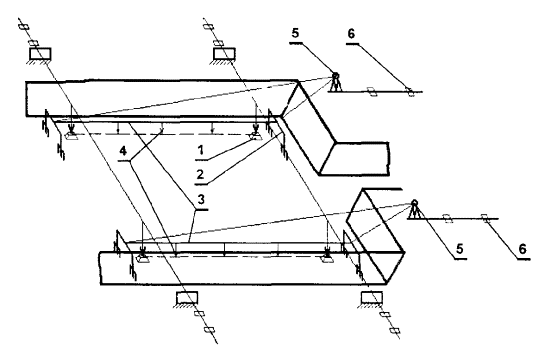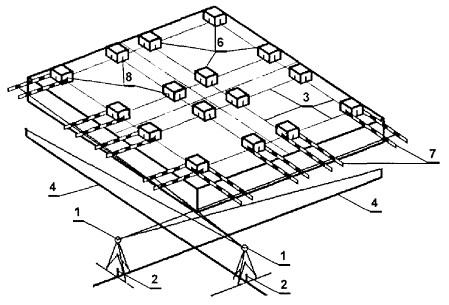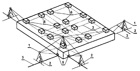 1 - теодолит; 2 - марка, закрепляющая ось на местности; 3 - основные оси; 4 - вспомогательные оси, параллельные основным осям; 5 - марка, закрепляющая ось на цоколе здания; 6 - оголовки колонн; 7 - линейка с делениями или рейка; 8 - риски, закрепляющие оси на оголовках колонн Определение монтажного горизонта выполняется с помощью нивелира. Передача отметок на монтажный горизонт осуществляется от марок и реперов высотной основы, заложенной на исходном горизонте. На монтажном горизонте должно быть не менее двух рабочих реперов. За отметку монтажного горизонта, как правило, принимается среднее значение перенесенных отметок. При выполнении работ по передаче отметок с исходного горизонта на монтажный отметки реперов на исходном горизонте здания надлежит принимать неизменными независимо от осадок основания. Перенесение отметок осуществляется или непосредственным измерением по вертикально установленным конструкциям от репера на исходном горизонте до монтажного горизонта, или методом геометрического нивелирования с помощью двух нивелиров, установленных на исходном и монтажном горизонтах, и подвешенной рулетки. В каркасных зданиях нивелируют опорные поверхности оголовков колонн. С помощью нивелирования определяют абсолютные отметки монтажного горизонта, по которым находят расчетный монтажный горизонт, за уровень которого принимают отметку наивысшей точки. Все результаты съемок высотного положения конструкций записываются в специальный журнал. Уровень монтажного горизонта отмечают маяками. Результаты измерений и построений при создании внутренней разбивочной сети на монтажных горизонтах следует фиксировать путем составления схем местоположения знаков, закрепляющих оси, ориентиры и отметки. Детальные разбивочные работы на монтажных горизонтах заключаются в нанесении разбивочных (промежуточных) осей, монтажных рисок на смонтированные опорные конструкции, в определении отметок опорных поверхностей. Разбивочные оси и монтажные (ориентирные) риски следует наносить от знаков внутренней разбивочной сети здания на монтажном горизонте. Количество разбивочных осей, монтажных рисок, маяков, места их расположения, способ закрепления должны быть указаны в ППР (ППГР). Детальные разбивочные работы на монтажном горизонте выполняются с помощью теодолита и линейных промеров рулеткой. Способы разбивки осей принимаются в зависимости от числа выносимых на этаж основных осей, которое устанавливается в зависимости от конструктивных особенностей здания и условий строительной площадки. В зданиях большой протяженности, имеющих ширину до 18 м, а также в том случае, когда применяется метод вертикального проектирования, может поэтажно переносится одна продольная ось. В этом случае для разбивки промежуточных осей теодолит центрируется над одной из точек, закрепляющей вынесенную ось, а трубу наводят на вторую точку, находящуюся на противоположном конце оси. Отложив в обе стороны угол 90°, рисками отмечают направление поперечной оси. Такую же операцию выполняют, перенося теодолит на вторую точку. В створе полученных направлений поперечных осей укладывают ленту, с помощью которой от точек вынесенной основной оси откладывают расстояния, соответствующие разбиваемым продольным осям. Положение поперечных осей определяют путем отложения с