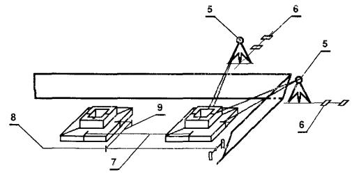 1 - маячные фундаментные блоки; 2 - скамеечные обноски; 3 - стальная проволока (леска); 4 - отвесы; 5 - теодолит; 6 - створный знак; 7 - рулетка; 8 - причалка; 9 - отмер от причалки Линейные измерения при детальной разбивке необходимо производить 20 - 30-метровой компарированной стальной рулеткой с введением поправок на компарирование, температуру, наклон и постоянным натяжением 98 Н (10 кгс). Вынесенные на обноску оси подписывают и закрепляют гвоздем или окраской на обноске, а также штырем под обноской. Оси, которые будут использоваться при переносе плановой сети здания с исходного горизонта на монтажный при возведении надземной части, закрепляют выносками - постоянными и временными знаками. По результатам разбивки составляется акт на разбивку основных осей здания с приложением исполнительной схемы. Монтаж фундаментных блоков ведут в соответствии с разбивкой на дне котлована или «под теодолит». При монтаже сборных фундаментов между одноименными осями, закрепленными на обноске, натягивают струны (тонкая проволока, леска). От отвесов, подвешенных на струнах, линейным отмером определяют положение осей и закрепляют их на дне колышками. От осей, обозначенных на дне котлована висящими отвесами или колышками с помощью шаблона определяют плановое положение угловых и маячных фундаментных блоков, которое фиксируется штырями. После снятия струн блоки монтируются. По граням угловых и маячных блоков натягивают шнур-причалку и монтируют все промежуточные блоки. При монтаже фундаментных блоков «под теодолит» предварительно размечают стаканы и подошвы фундаментов, для чего на стаканах и подошве наносят несмываемой краской риски, фиксирующие положение осей стаканов и подошвы фундаментов. Теодолит устанавливают над точкой закрепленной оси и крест стенки нитей зрительной трубы теодолита наводят на закрепленную точку противоположного конца оси. Наклонным лучом теодолита ось передают на укладываемый блок. Совпадение риски фундамента с вертикальной нитью сетки зрительной трубы показывает, что укладываемый блок принял проектное положение по одному из двух взаимно перпендикулярных направлений. Также ориентируют блок и по второй оси. Далее монтаж ведут при помощи теодолита и рулетки (или причалки). По теодолиту устанавливают фундамент относительно одной (продольной или поперечной) оси, а по другой взаимно перпендикулярной оси фундамент устанавливают по линейному отмеру, который производится от рисок ранее установленного фундамента, или по причалке. Через 2 - 3 ряда установленных фундаментов производят контроль точности их монтажа теодолитом по двум взаимно перпендикулярным осям, закрепленным на обноске (объем геодезического контроля должен быть определен в ППР, ППГР или другой технологической документации). Геодезический контроль, осуществляемый при монтаже фундаментов, оформляется геодезической документацией, в которую входят: исполнительная геодезическая схема, журнал геодезического контроля и др. документация, предусмотренная ППГР или ППР. При контроле сопоставляются измеренные размеры с размерами и отметками, указанными на чертежах, и величинами допусков, установленных нормативными документами. Контроль точности устройства фундаментов следует производить в плановом и высотном положениях. В плановом положении проверяют рассто