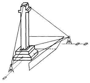Геодезические работы на монтажном горизонте должны выполняться в соответствии с требованиями проекта, СНиП 3.01.01-85*, СНиП 3.01.03-84, ППР, ППГР или другой технологической документации, утвержденной в установленном порядке. ППГР, геодезическая часть ППР или другая технологическая документация должны содержать: - требования по точности и методу создания внутренней разбивочной сети здания; - схему расположения и закрепления знаков сети, типы центров знаков; - методы передачи разбивочных осей и отметок на монтажные горизонты; - точность и методы выполнения детальных разбивочных работ, контрольных измерений, исполнительных съемок; - методику геодезических выверок при установке строительных конструкций и элементов в проектное положение. В состав геодезических работ на монтажном горизонте входят: - передача основных осей и отметок на монтажные горизонты; - определение монтажного горизонта на этажах; - детальная разбивка и закрепление осей и отметок на монтажном горизонте; - разбивка и закрепление рисок под монтаж элементов; - установка маяков; - выверка в процессе установки строительных конструкций в проектное положение; - производство исполнительных съемок и составление отчетной документации. Передачу плановой сети с исходного на монтажный горизонт производят методом наклонного проектирования теодолитом при возведении зданий малой и средней этажности, а также при наличии больших свободных территорий в границах строительной площадки. Передачу плановой сети с исходного горизонта на монтажный в условиях стесненной строительной площадки, а также при возведении зданий и сооружений повышенной этажности и высотных производят методом вертикального проектирования. В зависимости от условий строительной площадки и конструктивных особенностей зданий применяют различные методы монтажного переноса точек внутренней разбивочной сети здания при наклонном проектировании. Первый, так называемый способ бокового нивелирования обычно применяется при возведении протяженных зданий, не имеющих деталей, препятствующих свободному визированию вдоль фасада, а также в стесненных условиях строительной площадки. При переносе осей теодолит центрируют над марками, закрепляющими на местности вспомогательные оси, параллельные основным крайним продольным и поперечным осям здания. Направление оси проецируют на линейки, приложенные к перекрытию или к оголовкам колонн. По указанию наблюдателя линейки перемещают до получения отсчета, равного смещению вспомогательной оси от основной. Положение нулевого деления, соответствующее положению разбивочной оси, отмечают прочерчиванием риски на перекрытии или грани колонны. При втором способе теодолит устанавливают по линии переносимой основной оси на удалении от здания не менее его высоты. Теодолит центрируют над осевым знаком, а трубу наводят на риску, закрепляющую переносимую ось на цоколе здания, или на другой осевой знак. Для проектирования переносимой оси на перекрытие примерно в створе переносимой оси на перекрытии устанавливают визирную цель - треногу со штанговым или тяжелым нитяным отвесом, либо теодолит, оснащенный оптическим уровнем. В последнем случае визируют на острие карандаша, установленного над центром крышки объектива или окуляра выверенного теодолита. По указанию наблюдател